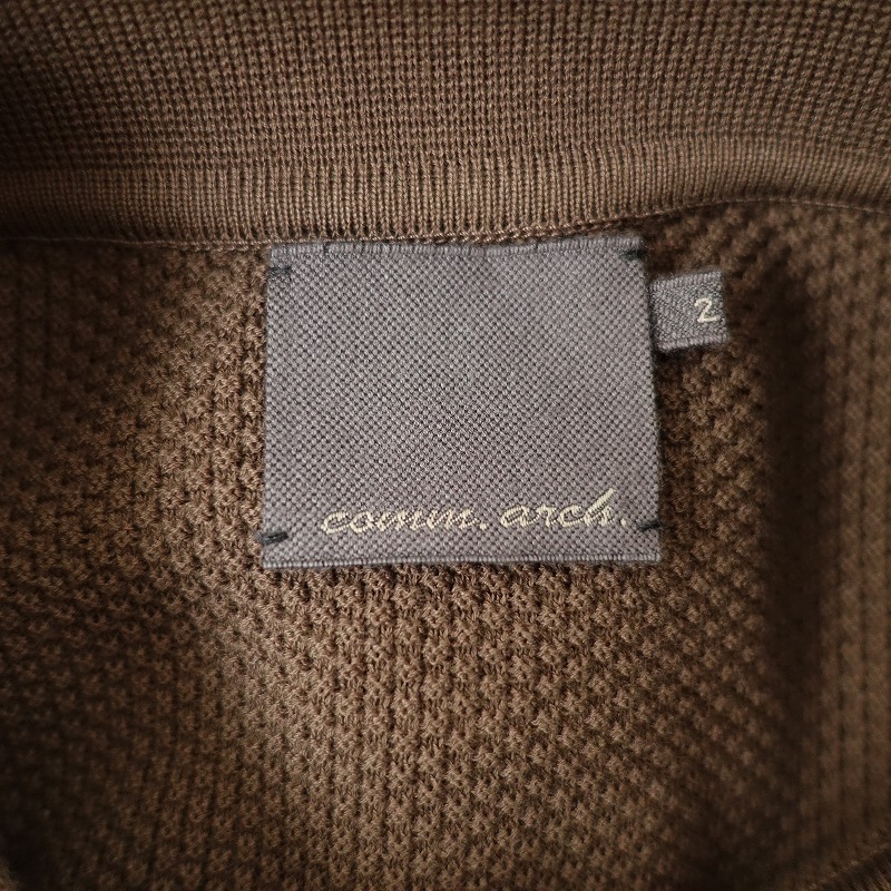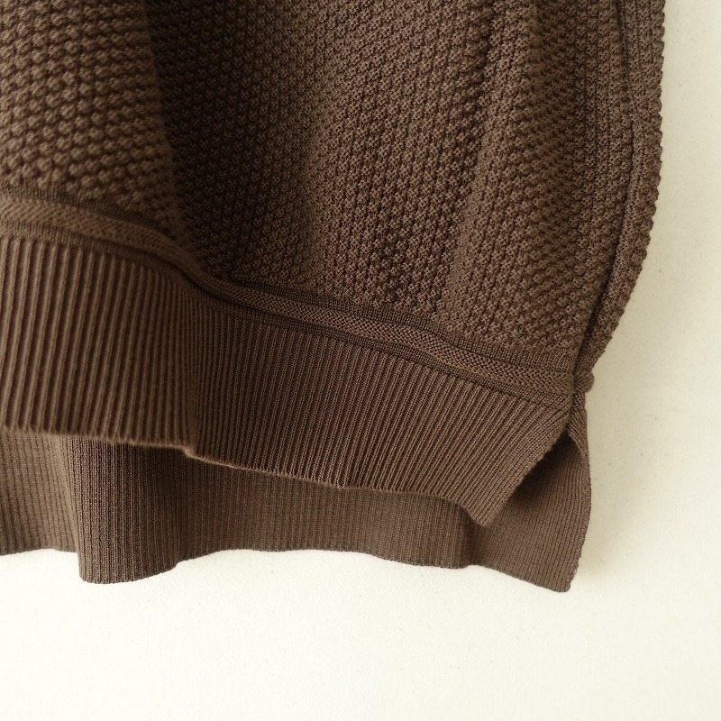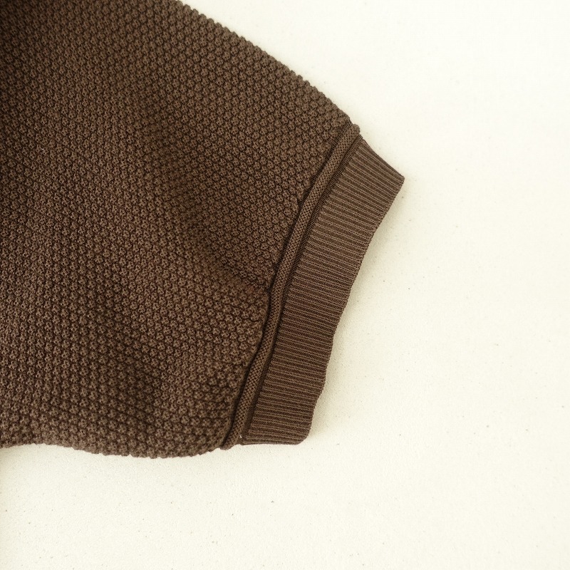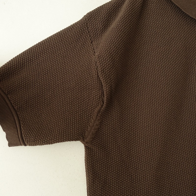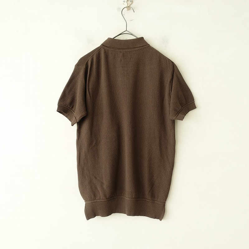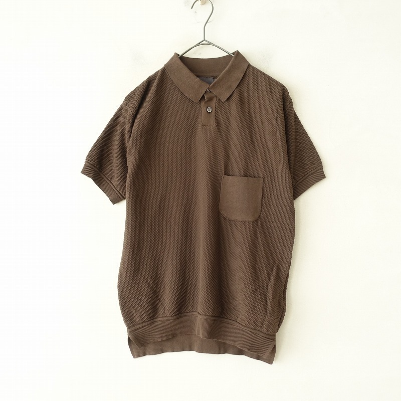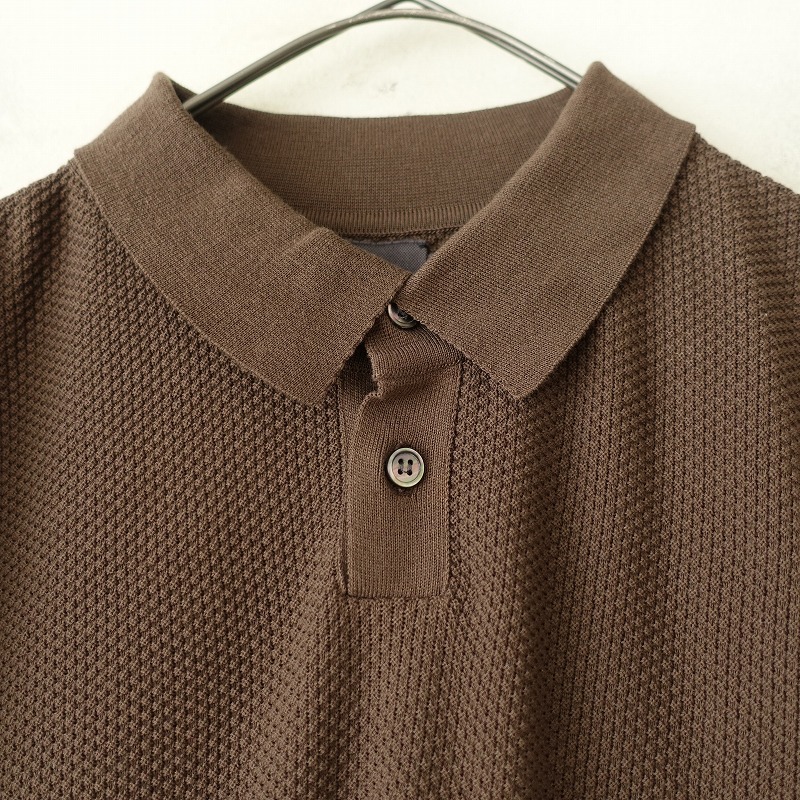 | comm.arch.のリネン鹿の子ポロシャツです。カラーはブラウンで、リネンの鹿の子素材で仕立てられています。ハーフボタン付きのプルオーバータイプで、裾はサイドにスリット入りの前後差のあるデザインです。 |