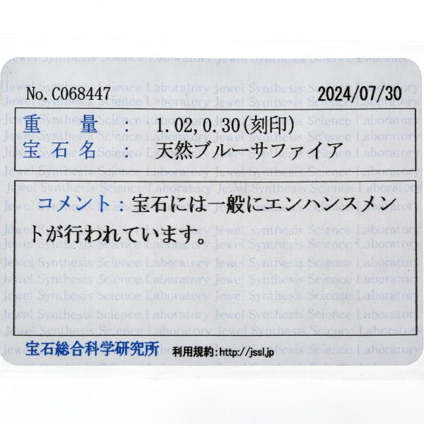 | 石目 | サファイア1.02ct ダイヤモンド0.30ct |