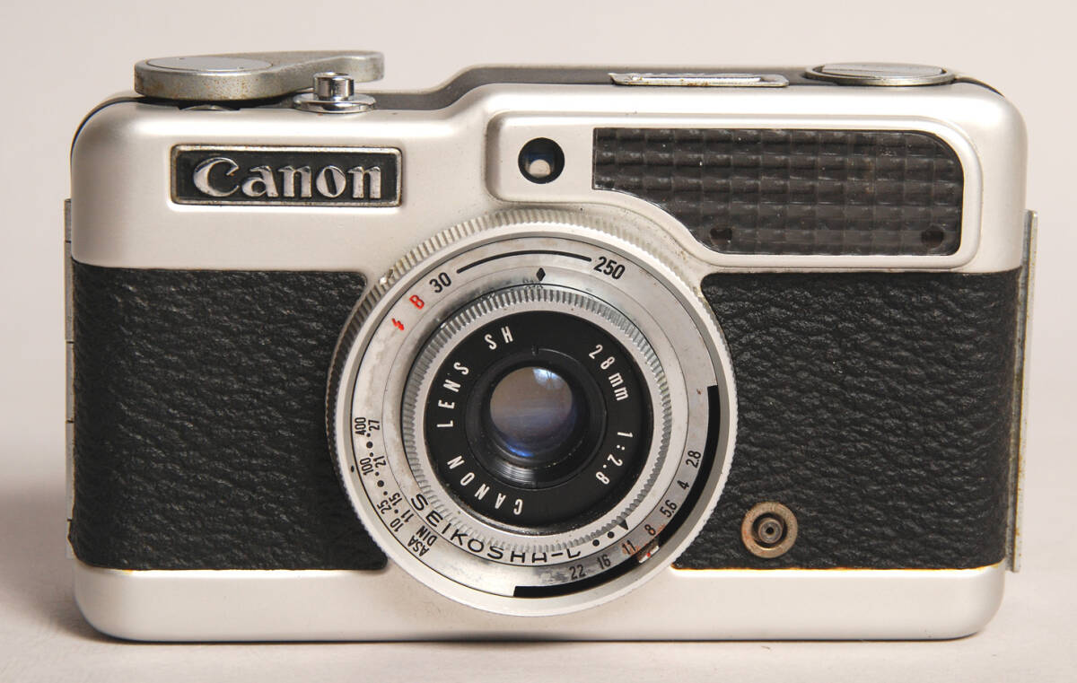 | * 商品説明 * 1963年に発売されたキャノンのハーフサイズカメラ「Demi」です。ストロボ発光、絞り、バルブ、シャッタースピードと絞りの連動は正常です。レンズはかなりキレイです。写せることは間違いはありませんが、ただ、セレン光露出計に関しましては??です。可愛らしいカメラです。お役立てください。・・24×18mm画面による35mm判のハーフサイズカメラは、1959年9月に発売されたオリンパスペンによって、ハーフサイズブームが招来された。キヤノンも、高級感があって操作性が良く、携行性に優れたハーフサイズカメラの開発に着手していた。被写体が明快に見える実像式ファインダーを採用し、28mm F2.8の明るい3群5枚構成の高性能レンズ、シャッターはビハインド式のライトバリュープログラムを搭載、適正露出を約束する追針合致式のセレン光電池露出計を内蔵するなど、高性能・高機能でありながら、ポケットに常時収めておきたいような可愛らしい外観フォルムであった。発売時、市場には既に先行他社の12機種があったが、人気カメラとして持てはやされた。デミは、半分を意味するフランス語が語源。 * 発送説明 * |