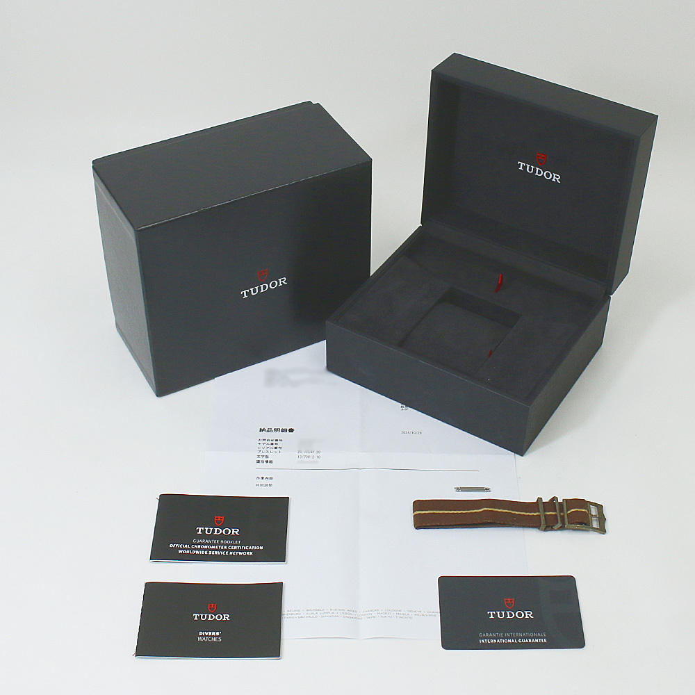 | 付属品 | 外箱(ダメージ有) / 内箱 / 取扱説明書 / 保証書(発行日付 2021年7月) / メーカー修理明細書(修理日 2024年10月 時間調整) /替ベルト(ファブリック) |