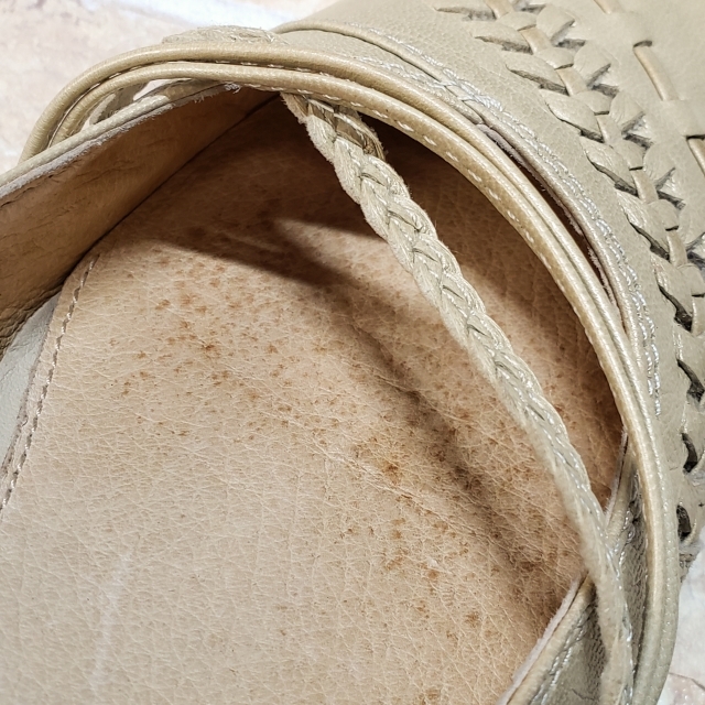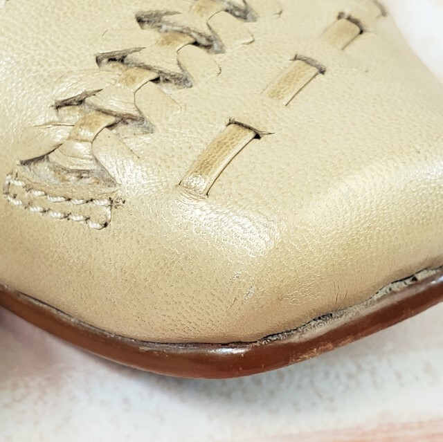 商品説明 | ・ベージュゴールドカラーのレザー ウエッジソール パンプスです。 アッパーの編み込みデザインがポイントです。 ・素材 レザー(本革) ・カラー ベージュゴールド(画像参照) ・付属品 無し ・サイズ 23.0cm アウトソール最大幅 約7.5cm アウトソール最長幅 約24.5cm ヒール 約4.0cm ・商品コンデション 左足かかとヒール下部に1か所めくれ、線所のスレ汚れがあります。(画像参照) 両足ヒール全体的にスレによる軽い毛羽立ちがあります。 右足つま先右側に極軽いスレがあります。 全体的に軽い色ムラがあります。 両足のインソールの爪先側全体にに細かな点状のシミ、色ムラがあります。 全体的に使用感がありますが、大きなダメージがなくまだまだご愛用頂けるコンデションです(画像参照) ※個人保管商品ですので、店舗コンディションをお求めの方はご入札をお控えください。ご理解の上ご入札お願いいたします。 |