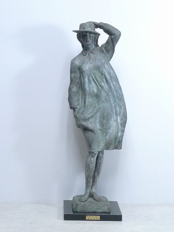 柴田鋼造作・ブロンズ彫刻『風の色』・ネームプレート付台座・高さ約70.5cm 重さ13kg・銅・女性像・帽子・置物・美術