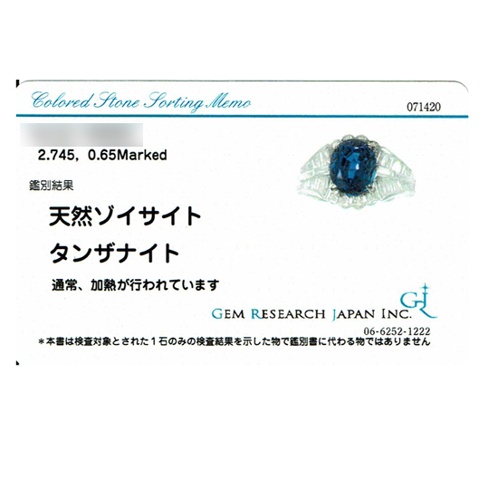 商品名 | GRJ/日宝協ソーティング付 Pt900 タンザナイト 2.745ct ダイヤモンド 0.65ct リング |