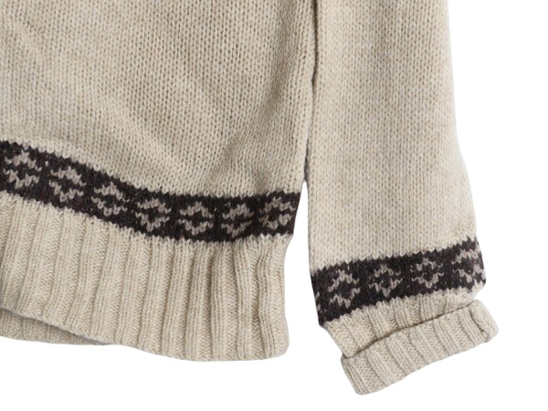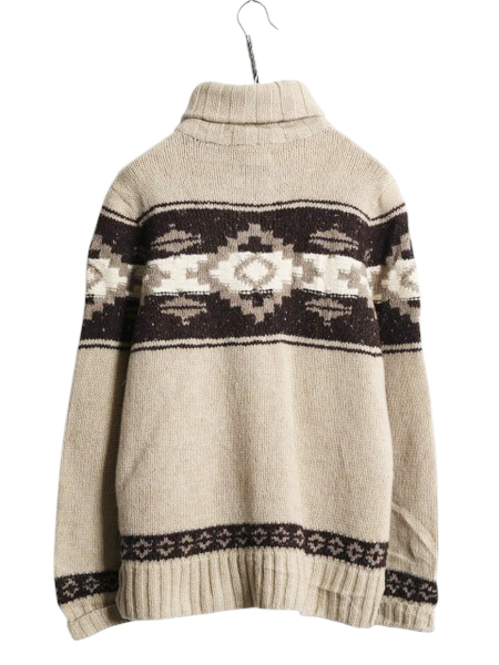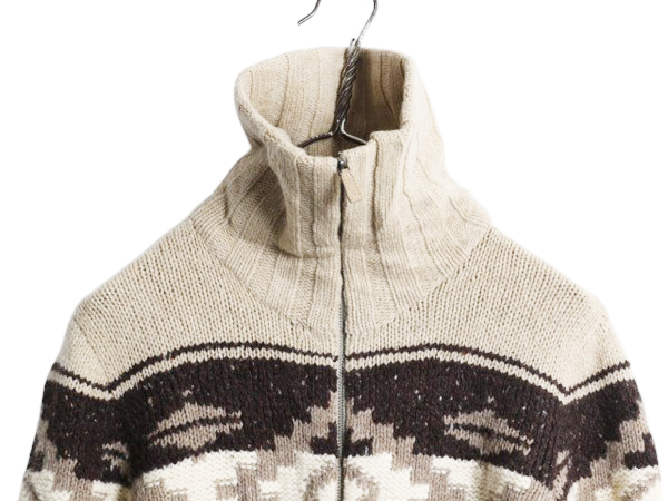 90年代のオールド 人気ブランド、LAUREN RALPH LAURENのニットカーディガンです 素材は、77% LAMBS WOOL 14% WOOL 7% NYLON 2% CASHMERE 繊維が細く、チクチク感が少ない、保温性の高いラムウール その軽さに対し保湿性が抜群でやわらかな肌触りのカシミヤの混紡 ストレスのない着心地の快適なミドルゲージ タートルネックタイプ、襟を高く設定することによって 首周りの保温力も高くなっています。 ジップを下すことで、首元の様々なアレンジを楽しむことができます フロントジップはスウェードトップ付きのE/Pダブルジップを使用 HAND KNIT(手編み ハンドメイド) 熟練の職人さんが1針1針丁寧に編み込んだ 独特の暖かみがあります。 ハンドメイドの商品は、高級かつ流通も少なく 状態の良い完品はなかなかお目にかかれません。 合わせやすい 落ち着いたライトベージュベースに ネイティブ柄を思わせる総柄 オールドラルフローレンのグッドデザイン こういった商品はいつでも手に入る物ではありません 凝った丁寧な作り、存在感のあるデザイン ラルフローレンのセンスと美学が伺える 玉数の少ない入手困難な商品です。 |