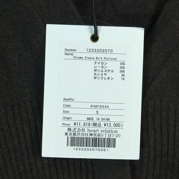 【タグ付き】Volume Sleeve Knit Pullover ニット カットソ- espresso 長袖 Her lip to