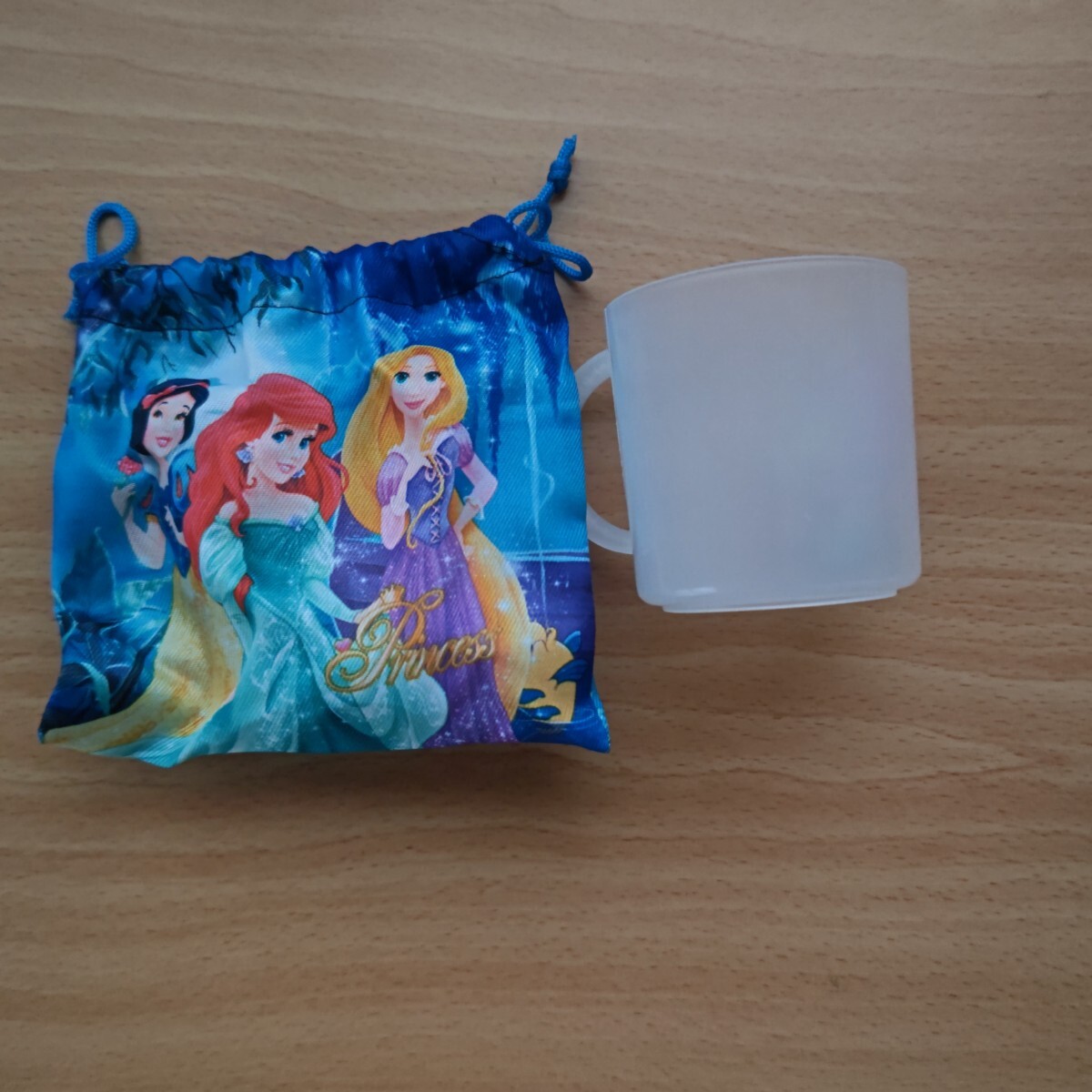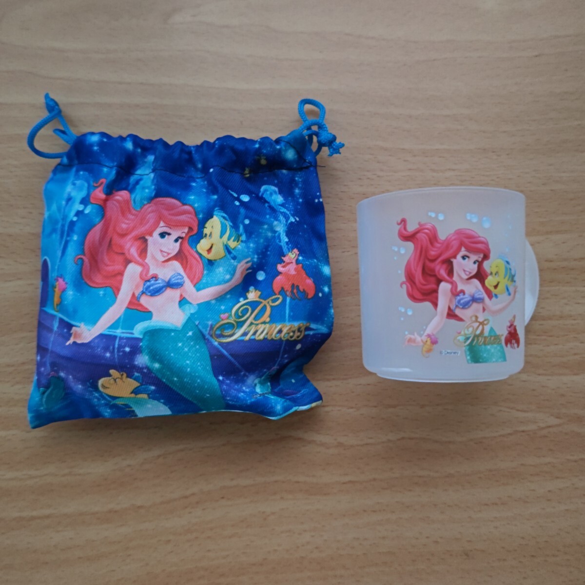 ディズニーキャラクター アリエル のプラスチックコップと巾着袋のセットです。