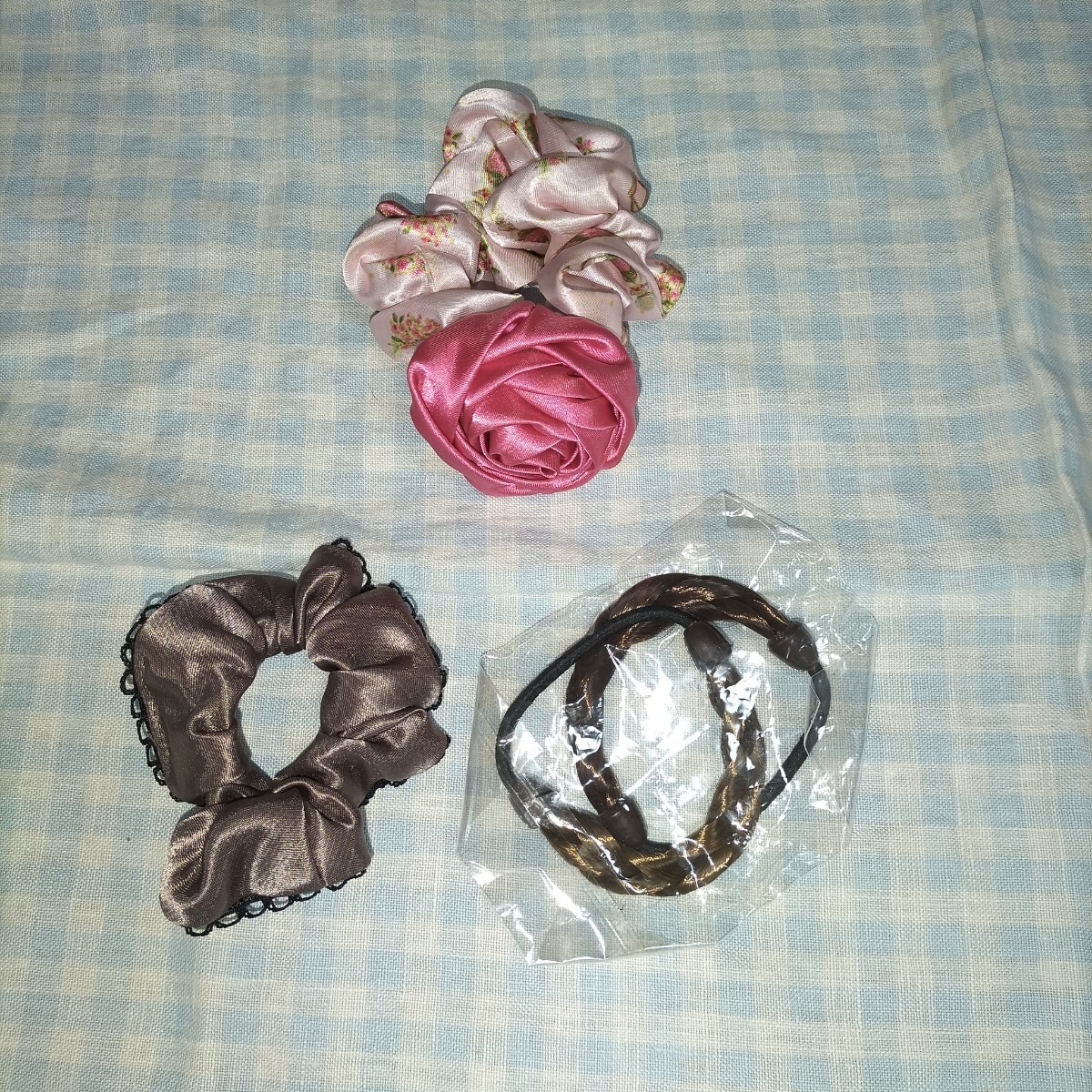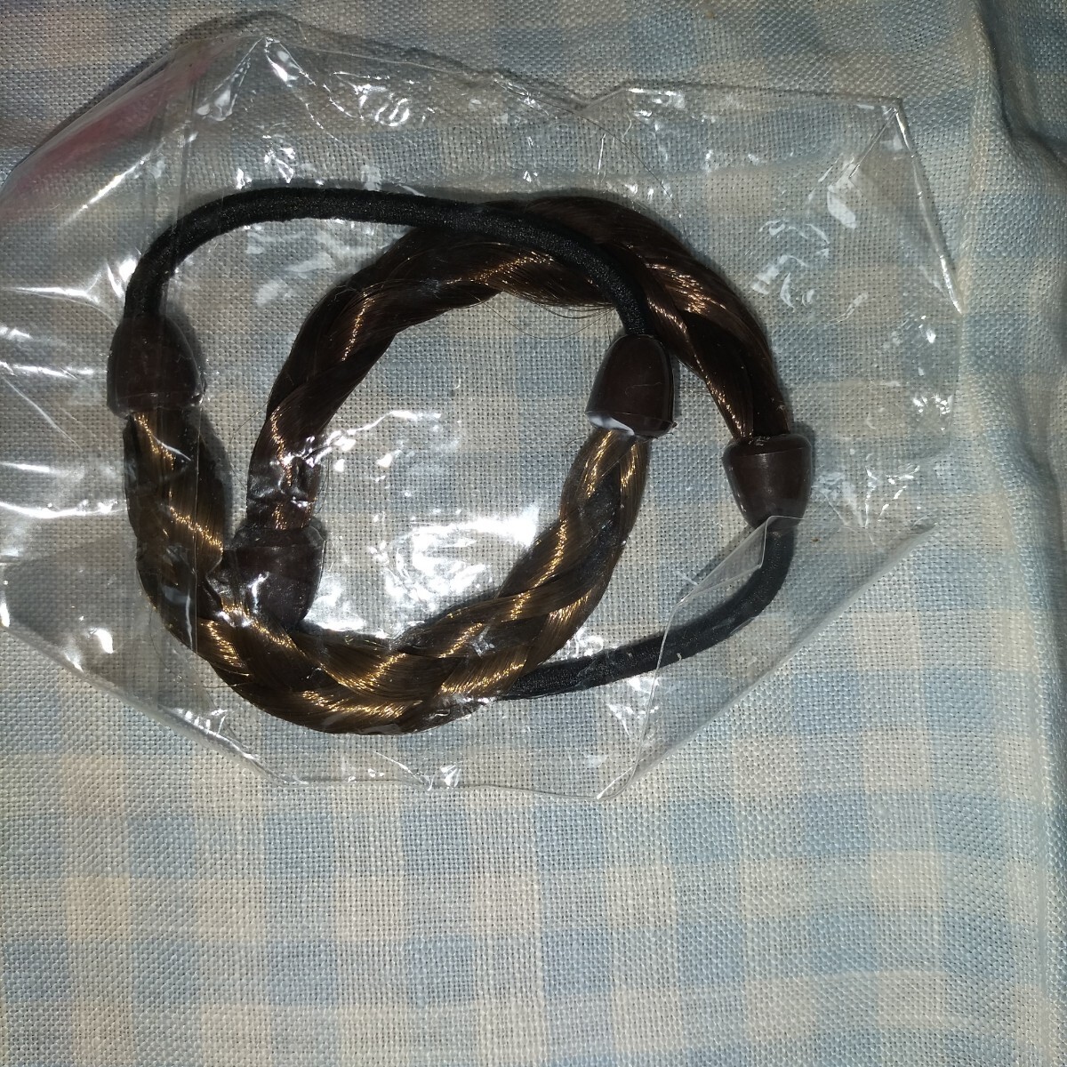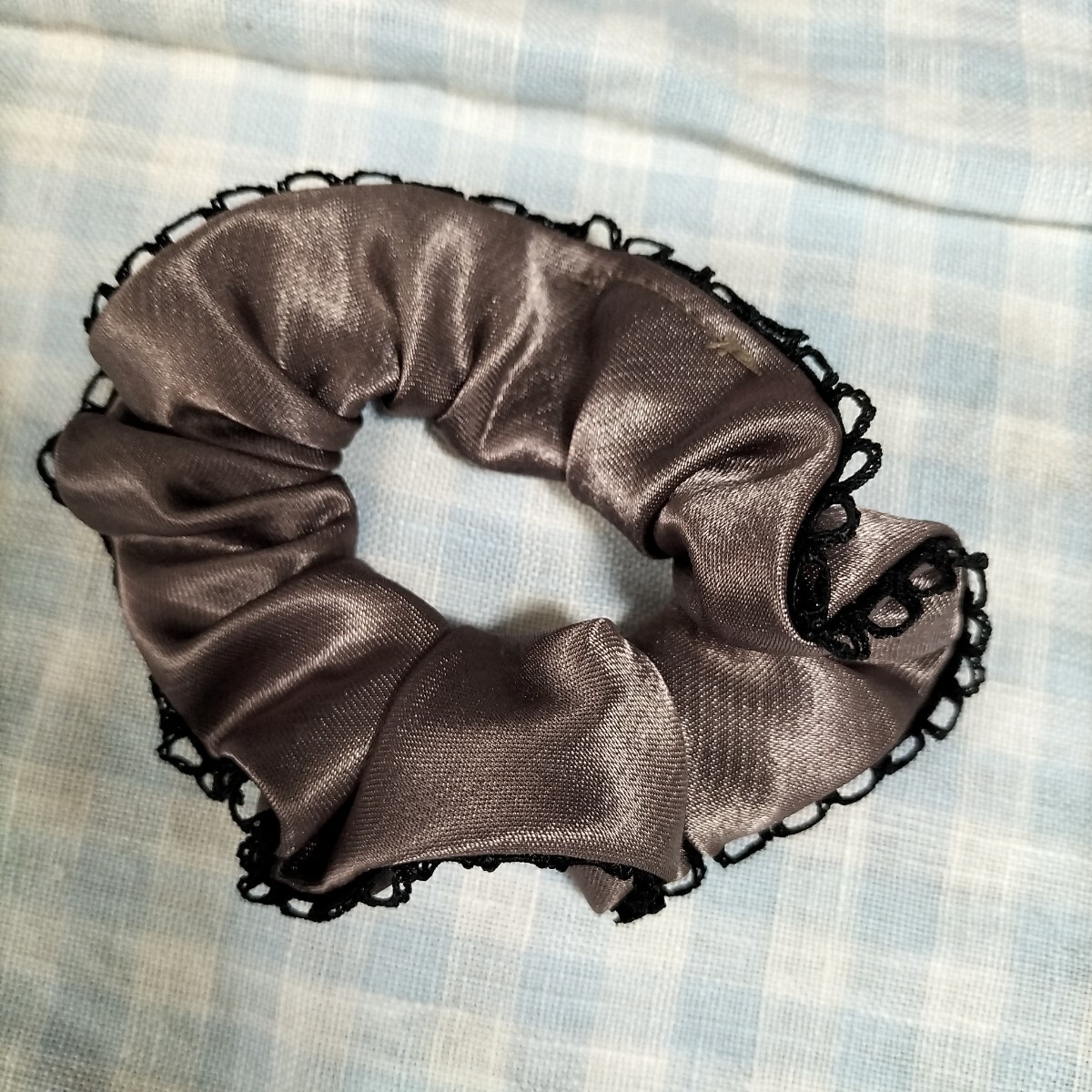 シュシュは使用したかどうかわかりません。ヘアゴムは使用していません。髪の色は少し茶色です。ゴムの色は黒です。