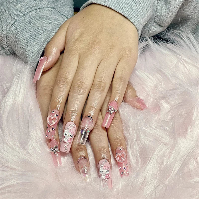 両面テープ入りで簡単に剥がせるから、休日やライブ、特別な日だけでも楽しめるネイルチップ。 デザインはキャラクターのモチーフに合わせた3種類をご用意! ●シナモロール シナモンの青空をイメージしたカラフルなグラデーション。 さらに大きめなホワイトリボンで雲をイメージしました♪ クリアなハートが映えるネイルチップに☆ ●マイメロディ かわいさをふんだんに取り込んだピンク仕様のデザイン。 付け根にピンクのラメラインをつけることにより、かわいさ×抜け感ネイルに! モチーフのお花やリボンも特商的で思わずうっとり! ●クロミ 他の種類と比べてゴテっとさを意識したクロミちゃんデザイン。 紫をベースとしたグラデーション×フレンチのデザインは、どこか大人っぽさを感じますが、 大きなリボンやラインストーンをつけることによりキュートさをプラス! 特別な日だけの特別な指先に♪ 70枚入りなので、爪の形やお好みのデザインによって変更することが可能です。 お好きな種類をお選びください! 商品番号: DIY005