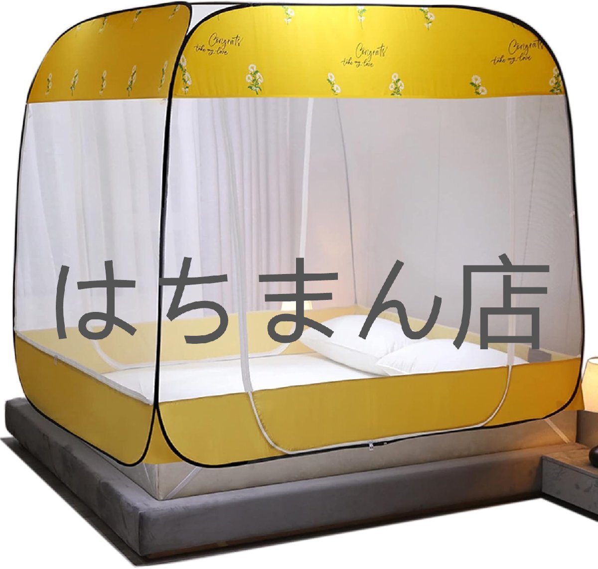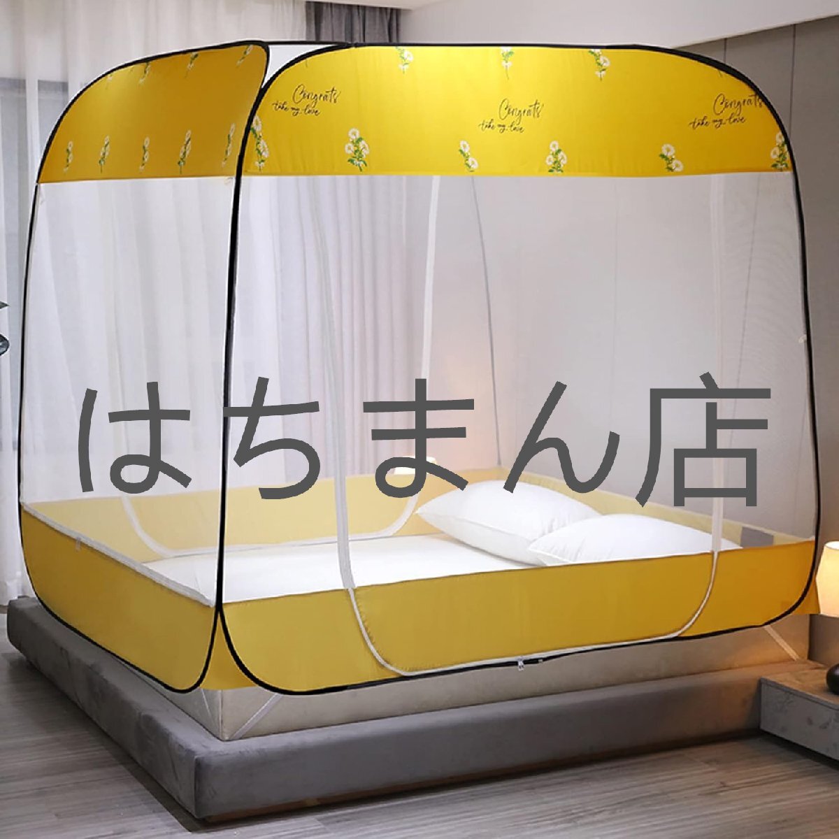 蚊帳 ワンタッチ 底付き シングルベッド用 ダブルベッド 3ドア設計 かや 蚊帳 ベッド用 畳 大型 収納袋付-180x200x165cm-yellow