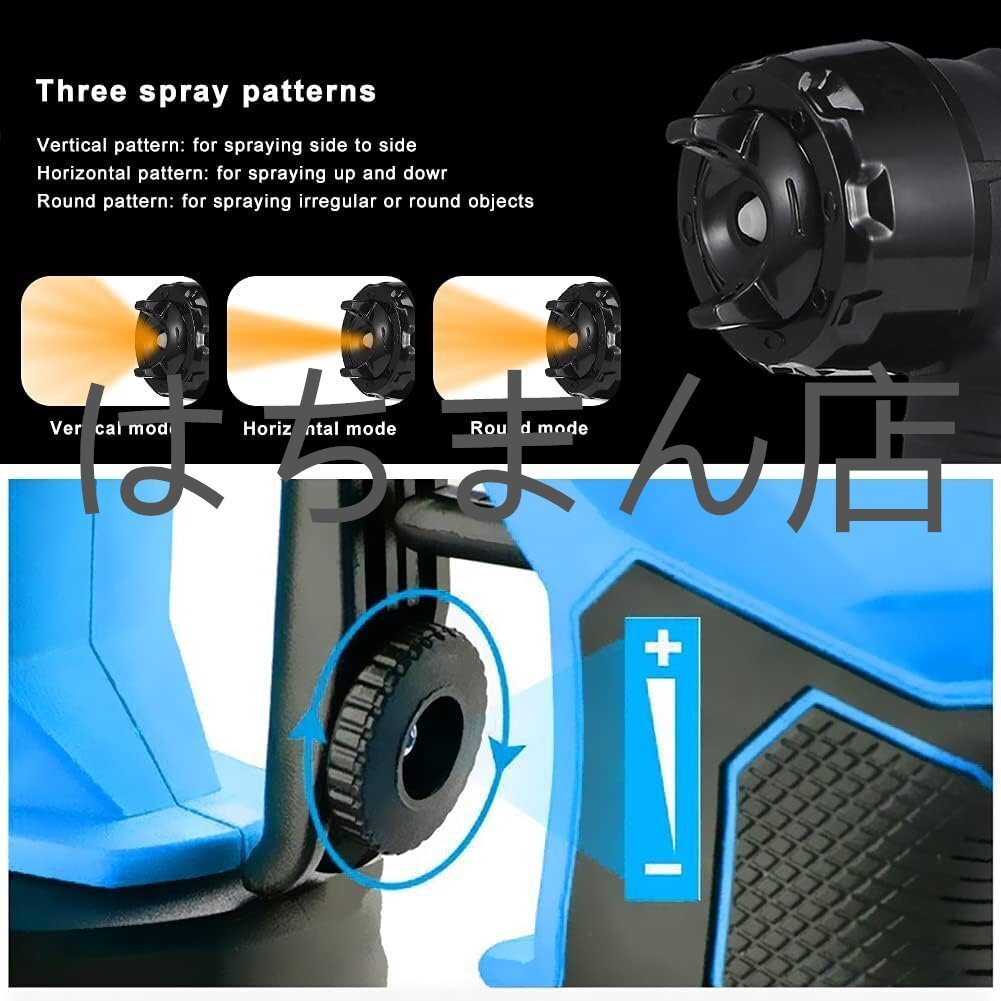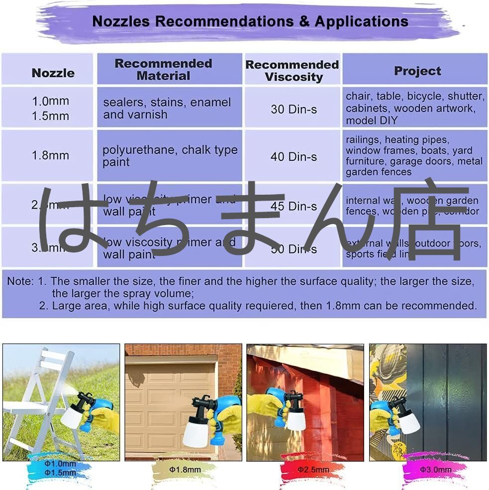 【5つのノズルサイズと3つのスプレーパターン】電動ペイントスプレーツール、水平、垂直、円形の3つの異なるスプレーパターンに調整でき、5つのサイズのノズル(1.0mm / 1.5mm / 1.8mm / 2.5mm / 3.0mm)を備えています。家具、車、フェンス、キャビネット、壁、ガレージドア、庭のテーブルや椅子などの塗装プロジェクト。ペイントスプレーは作業をより効率的にし、スプレー面をより均一にします。