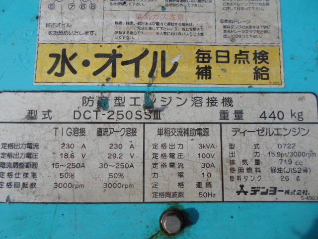 ご覧いただき ありがとうございます トラブルを避けるため最後までお読みください。 ----------------------------------------------------------------------------------------- ■Denyo TIG/DC WELDER DCT-250SSⅢの 中古品 ----------------------------------------------------------------------------------------- ・ 防音型エンジン溶接機 Denyo TIG/DC WELDER DCT-250SSⅢ ・ アワメーター3642Hr ・ ディ-ゼルエンジン ・ エンジンかかります ・ 動作確認は線が無なくできません。 ・ 仕入先からは稼働品と聞いています。 ・ 小傷,汚れ等あります。 ・ 詳しい知識が無く見落とし記載誤り等あるかもしれません。 ・ 現品確認をお願い致します。 ・ 現状販売となります。 ・ 発送は第一貨物支店留置き着払いになります。 ・ 新潟県上越市からの出品になります。 ----------------------------------------------------------------------------------------- その他にも商品を出品しておりますので宜しければご覧下さい。 |