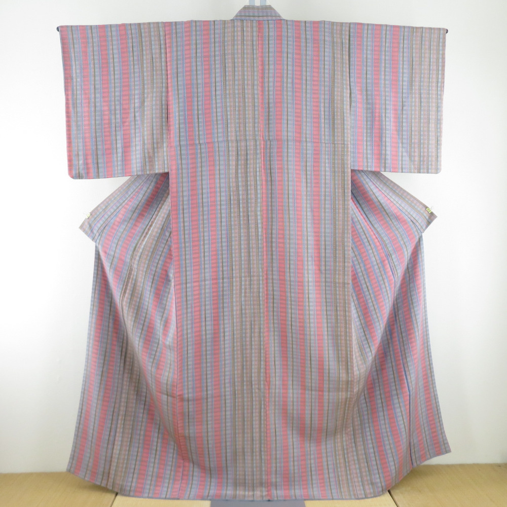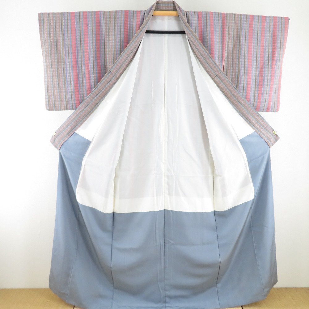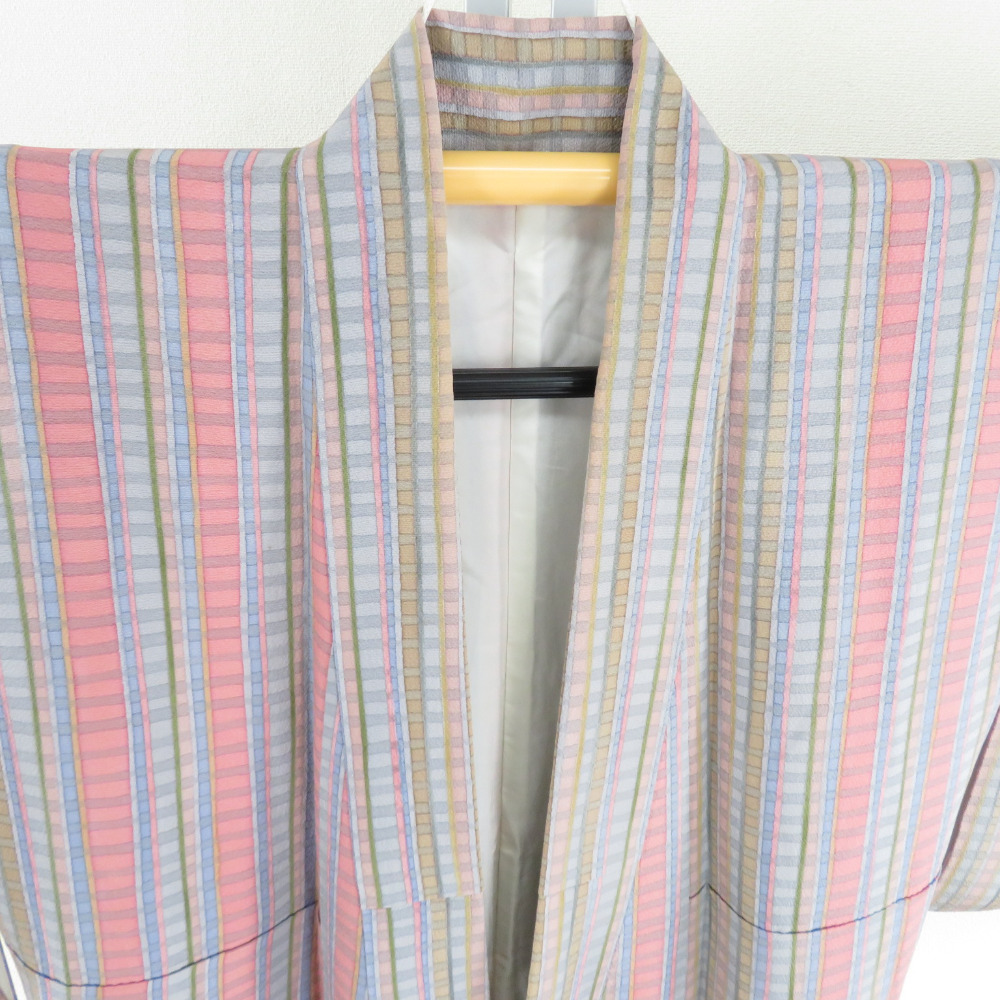 | 小紋 格子文様 袷 バチ衿 灰桃色 正絹 仕立て上がり カジュアル着物 身丈161cm |