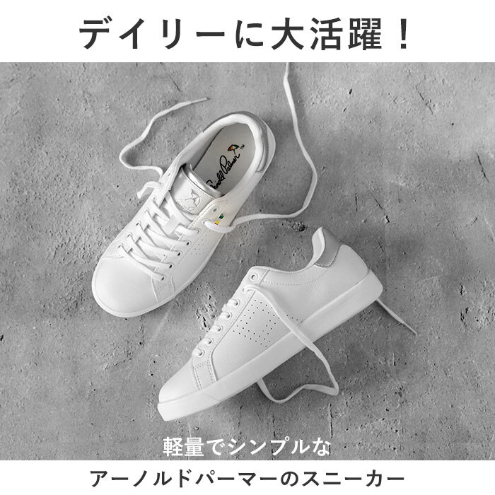 商品説明 | ・可愛らしい傘マークがおなじみの「Arnold Palmer」からデイリーユースにおすすめなレディーススニーカーが登場。 ・インソールのかかととシュータン部分には「Arnold Palmer」の可愛い傘マークとサイドには傘マークと同じ色のタグが付いており、シンプルながらもおしゃれなアクセントに♪ ・アッパーは汚れが拭き取りやすい合成皮革を使用。サイドには通気口もあり、気になるムレも逃がしてくれる◎ ・アッパーとアウトソールは軽く、たくさん歩いても疲れにくい♪ ・通勤通学や普段使いにたくさん履きたくなる可愛いシューズ! |
