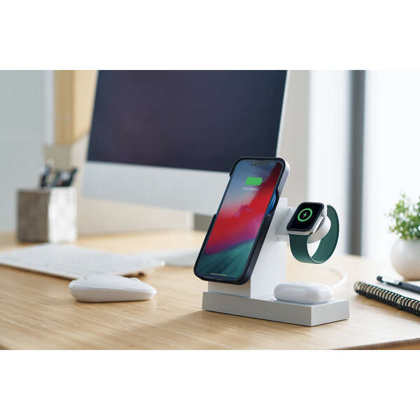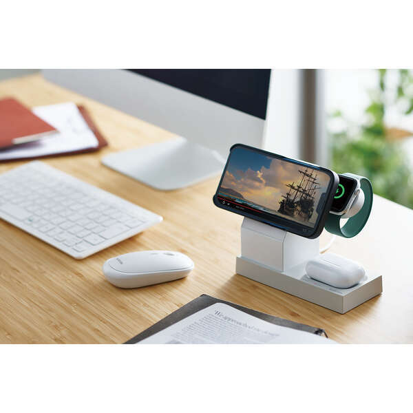| 対応機種 | マグネット部:MagSafe規格対応iPhoneシリーズ、 台座部:ワイヤレス充電に対応したAirPodsシリーズ、 Apple Watchホルダー部:Apple Watchシリーズ (Apple Watch磁気充電ケーブルをはめ込んだ場合) |