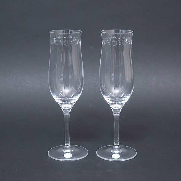 アメリカを代表するジュエリーブランド、ティファニーのスウィングのシャンパングラス(ペア)。 ボウル上部に大小の水玉模様の装飾が施されています。シンプルで飽きのこないデザインです。 ■サイズ 口径49 × 高さ196mm ■付属品 箱、シオリ ■状態 A(美品):未使用品とのことで、非常に状態の良いお品物です。 |