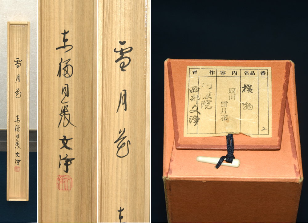 【真作】同聚院 西部文浄 扇面「雪月花」です。 本作は紙本です。 美品で目立つシミや皴はなく比較的綺麗な状態です。 ※撮影の際に生じた写り込みなどがございます。 ご理解の程よろしくお願い致します。 |