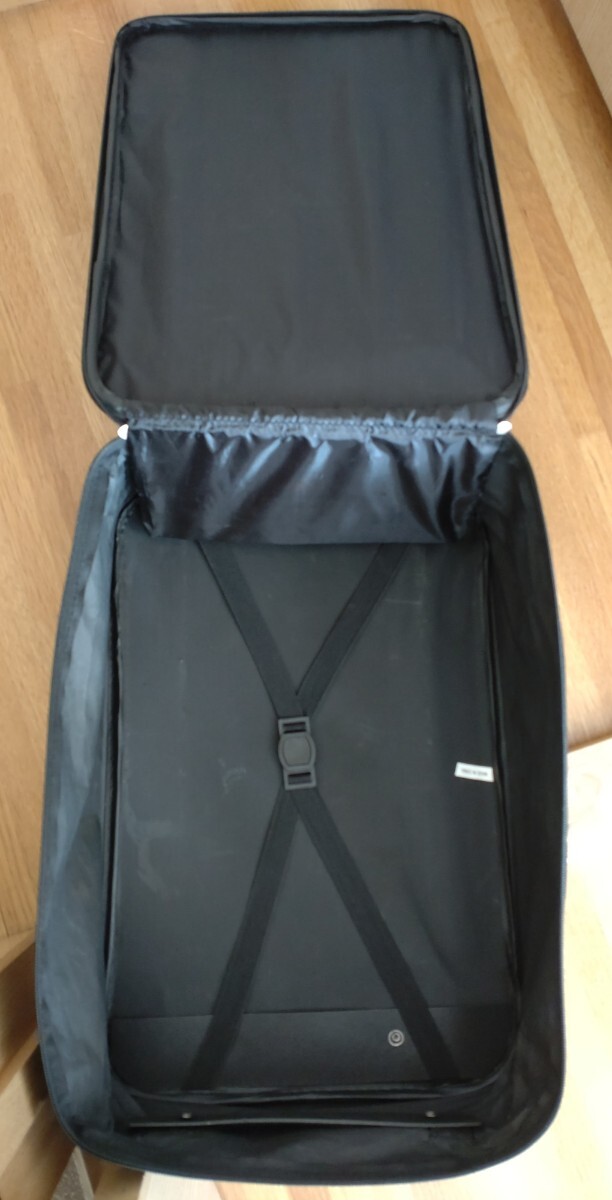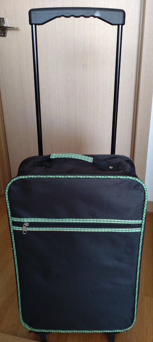 黒と緑のアクセントが特徴の中型キャリーカート、伸縮式ハンドルと外部ポケット付きで便利。