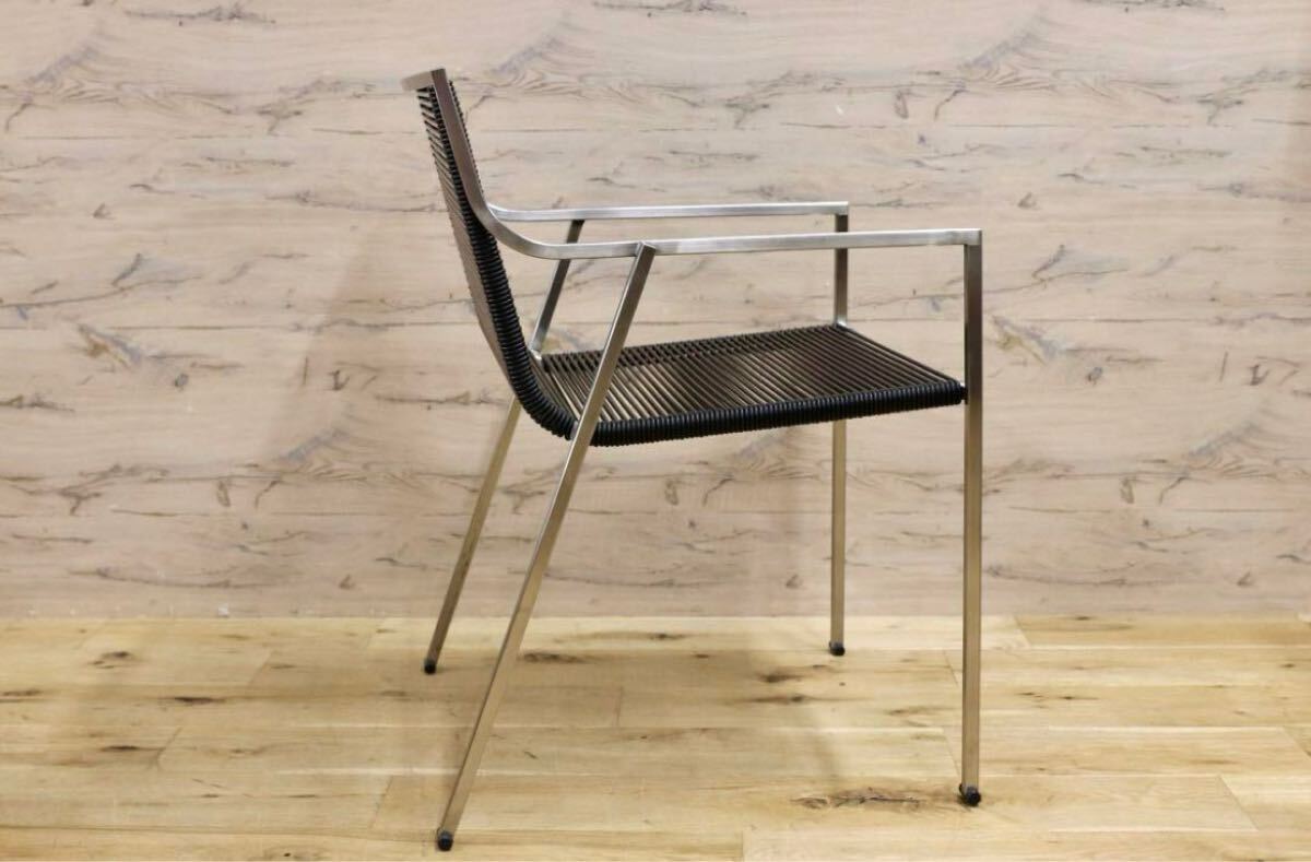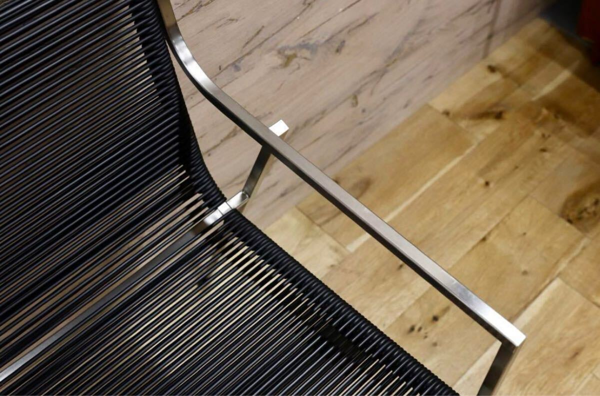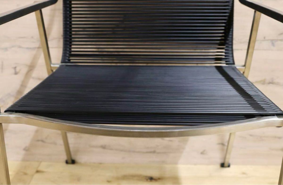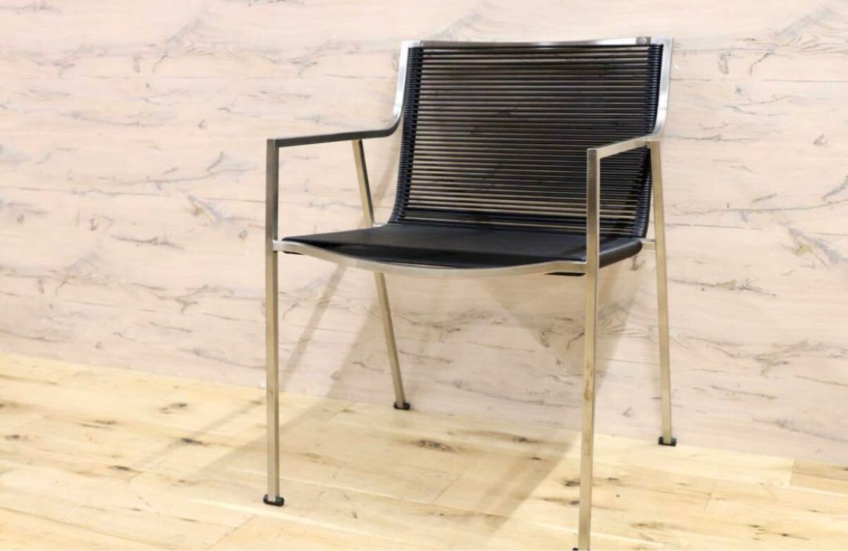 今回のチェアは、そのような素材の良さにこだわり、軽量ですがしっかりとしたデザインを兼ね備えております。サテン仕上げのスチールフレームは、シンプルな直線ですが、着席する際に足が触れる部分は柔らかく曲線になっており、全体の雰囲気が損なわれず、使用感がとてもよいです。さらに、座面をナイロン強化PVCコードで二重の網目にすることで、しっかりと体を支えつつ見た目にはとてもスタイリッシュです。