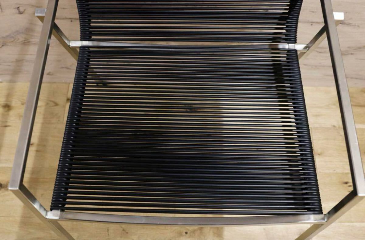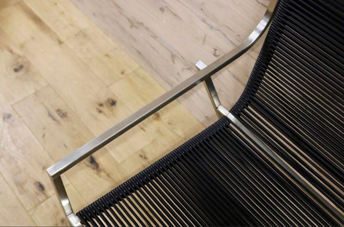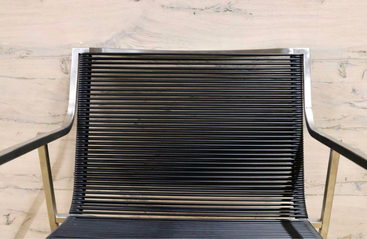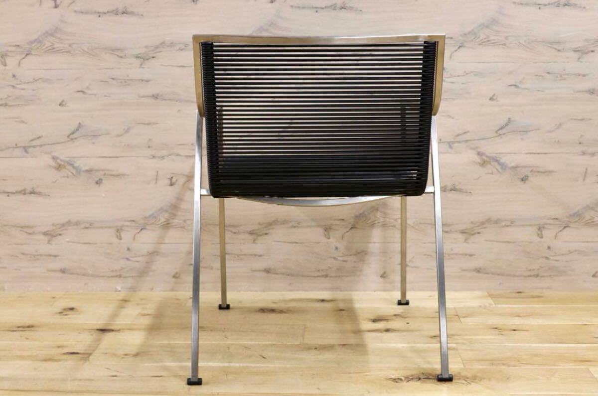 今回のチェアは、そのような素材の良さにこだわり、軽量ですがしっかりとしたデザインを兼ね備えております。サテン仕上げのスチールフレームは、シンプルな直線ですが、着席する際に足が触れる部分は柔らかく曲線になっており、全体の雰囲気が損なわれず、使用感がとてもよいです。さらに、座面をナイロン強化PVCコードで二重の網目にすることで、しっかりと体を支えつつ見た目にはとてもスタイリッシュです。