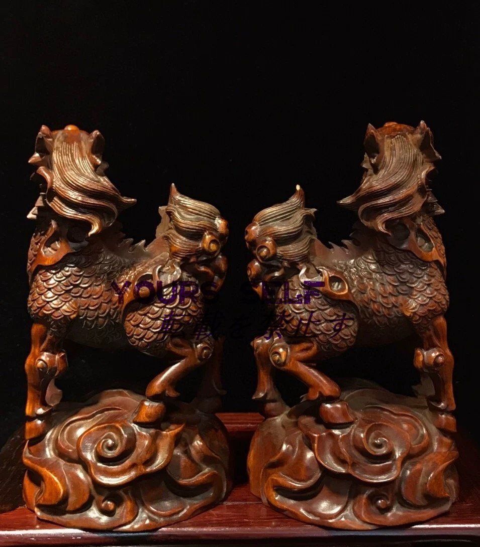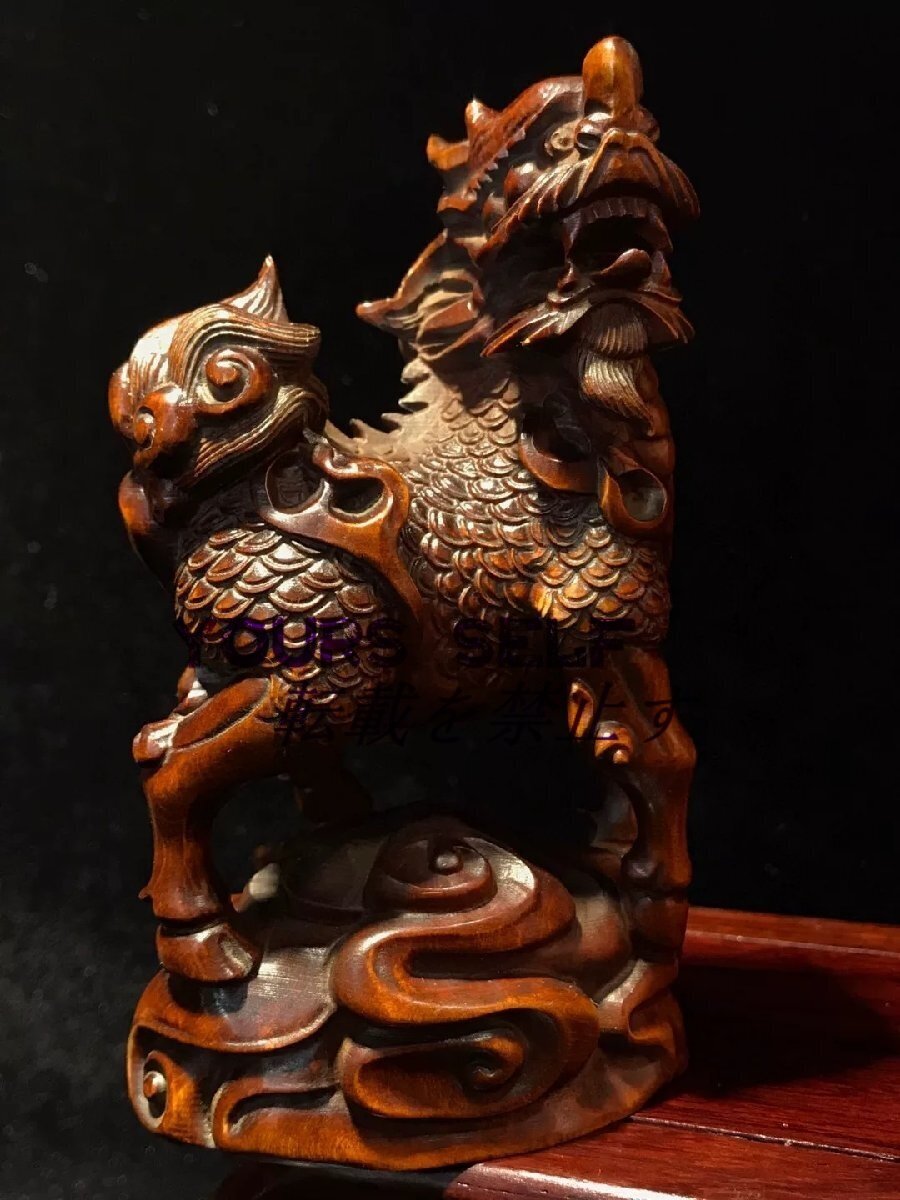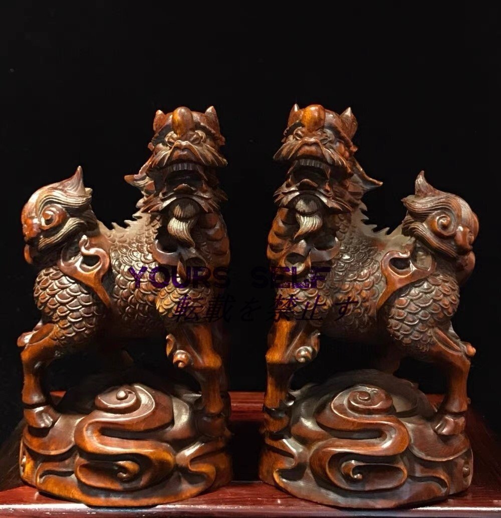 【縁起物】麒麟 置物 木彫り細密彫刻 木製 風水 古美術品