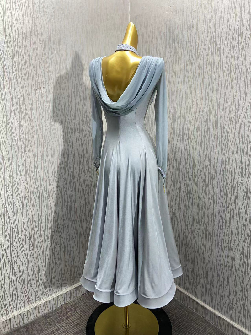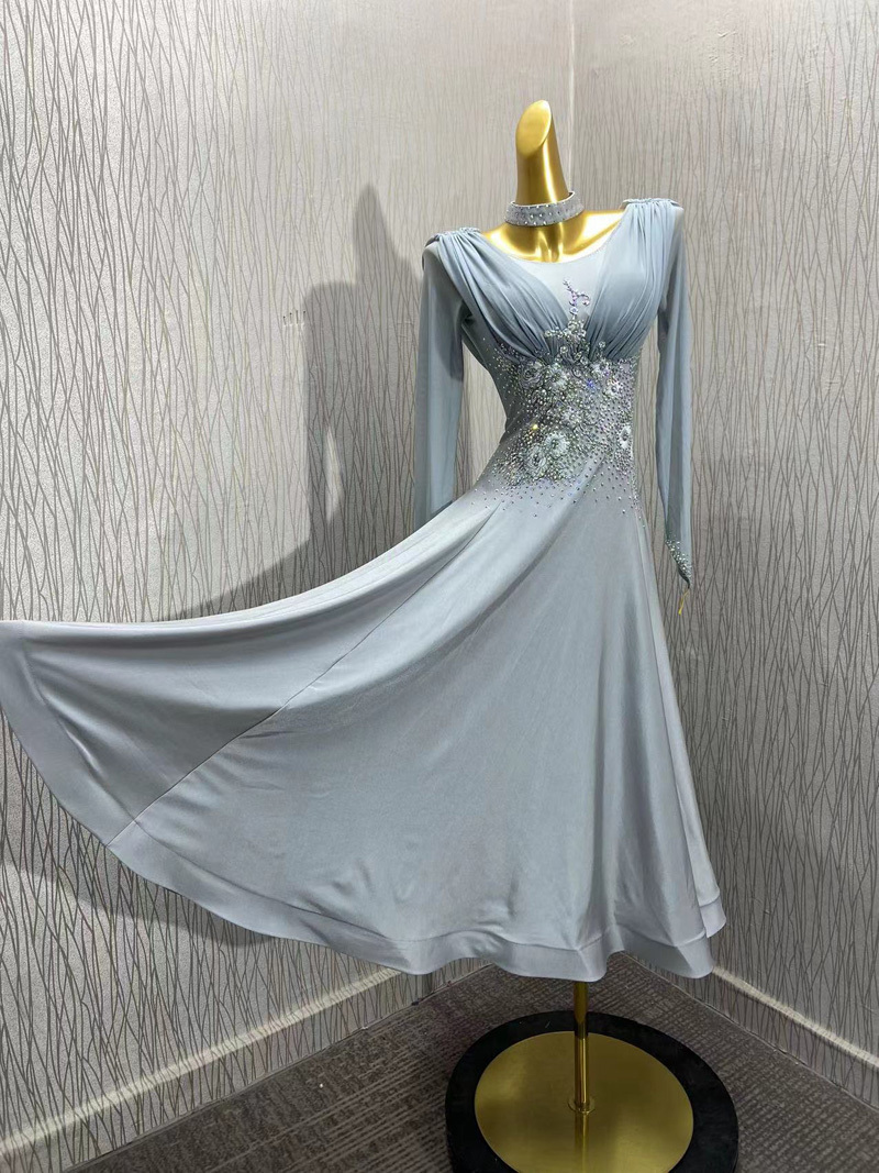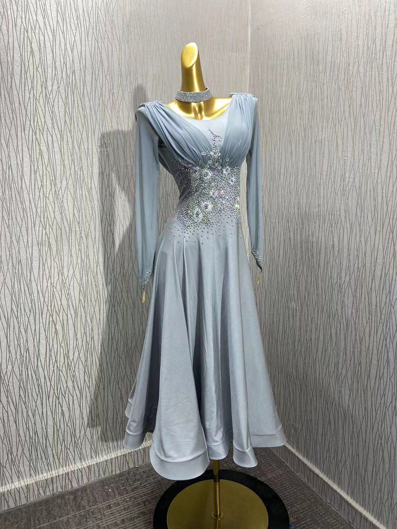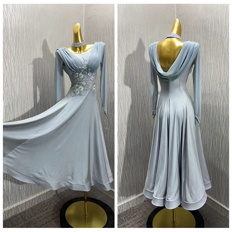 新品 セミオーダードレス レディース社交ダンス衣装 ダンスドレス モダン練習試合用ダンスドレス モチーフ飾り グレー 良品