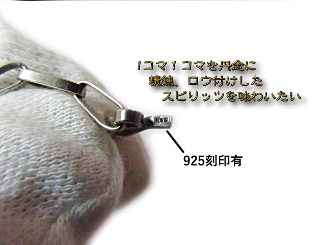 チェーンの1コマ1コマを丁寧に曲げ、ロウ付けし磨き上げた仕上がりは機械生産では出せない手触りや風合いが特徴です。