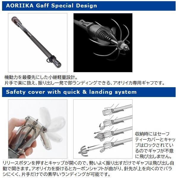収納時にはセーフティーカバーとキャップはロックされているのでギャフが不意に飛び出しません。リリースボタンを押すとキャップが開く新機構を採用。あとは勢いよく振り出すだけでギャフが飛び出し自動で開き、アオリイカを掛けるとシャフトが曲がり針先が上を向くのでバラシにくく片手だけでの素早いランディングが可能です。服装や状況に合わせてハンガースタイルとショルダーストラップスタイルが選択できます。サイズ:500cm仕舞寸法:62cm重量:ハンガー装着時合計 500g ショルダーストラップ装着時合計 520g (★複数在庫あります)4995915332017 |