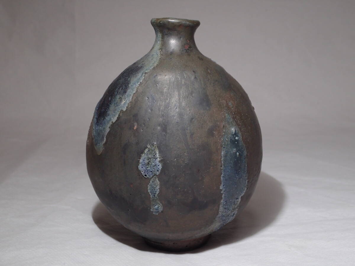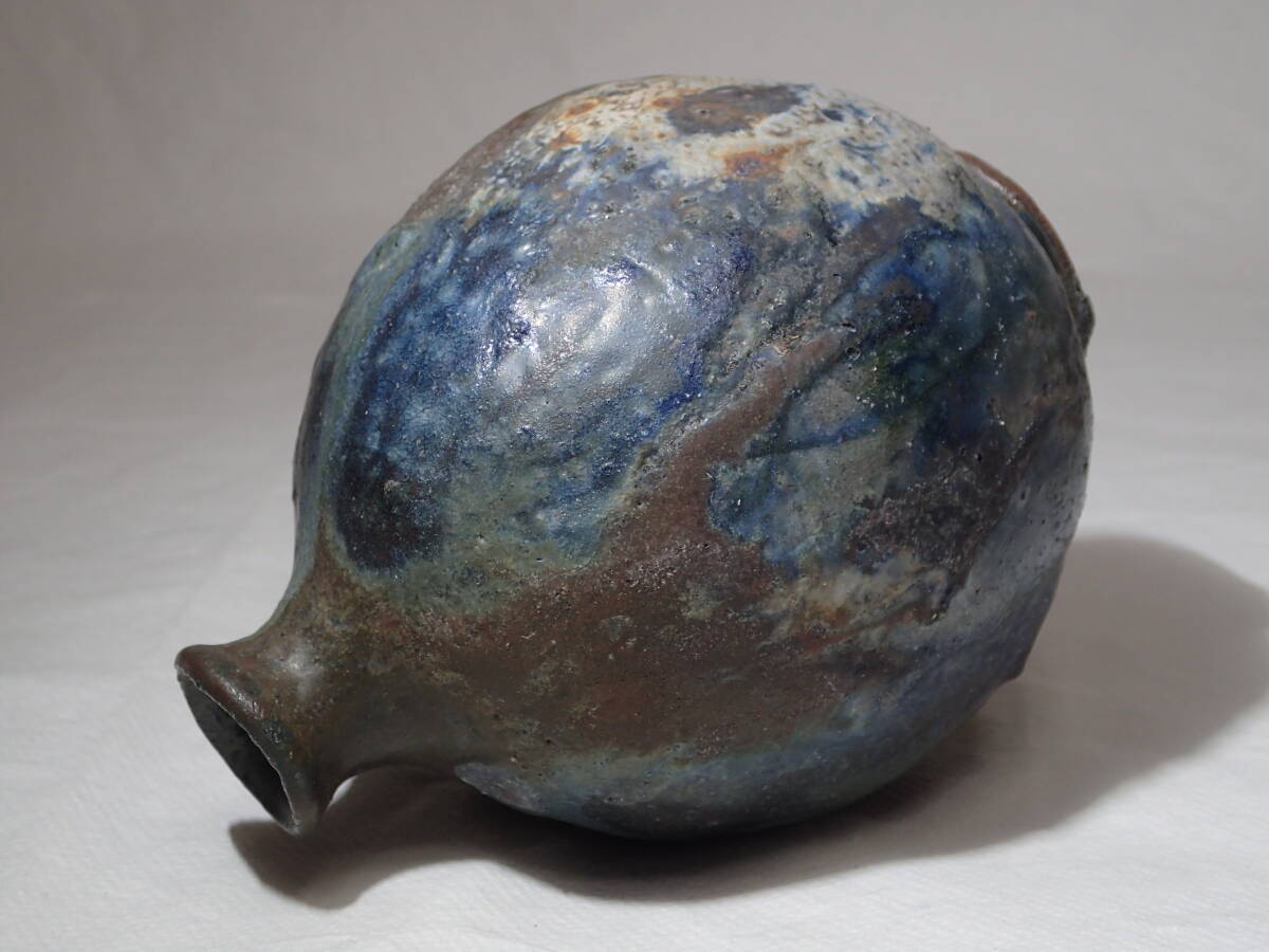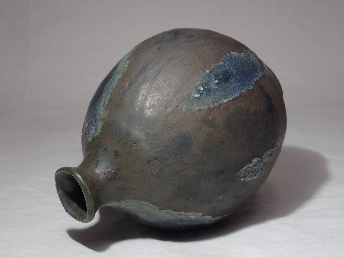 ・池田作品の中では珍しい黒織部扁壺、稀少な作品です。 ・極限まで燃焼させて現れた数々の窯変、見飽きない扁壺です。 サイズ 胴径12cmx10cmx高さ15cm