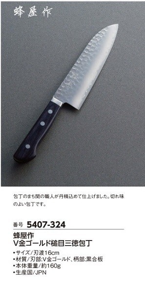 【商品番号】 5407-324 【商 品 名】 蜂屋作 V金ゴールド槌目三徳包丁 |