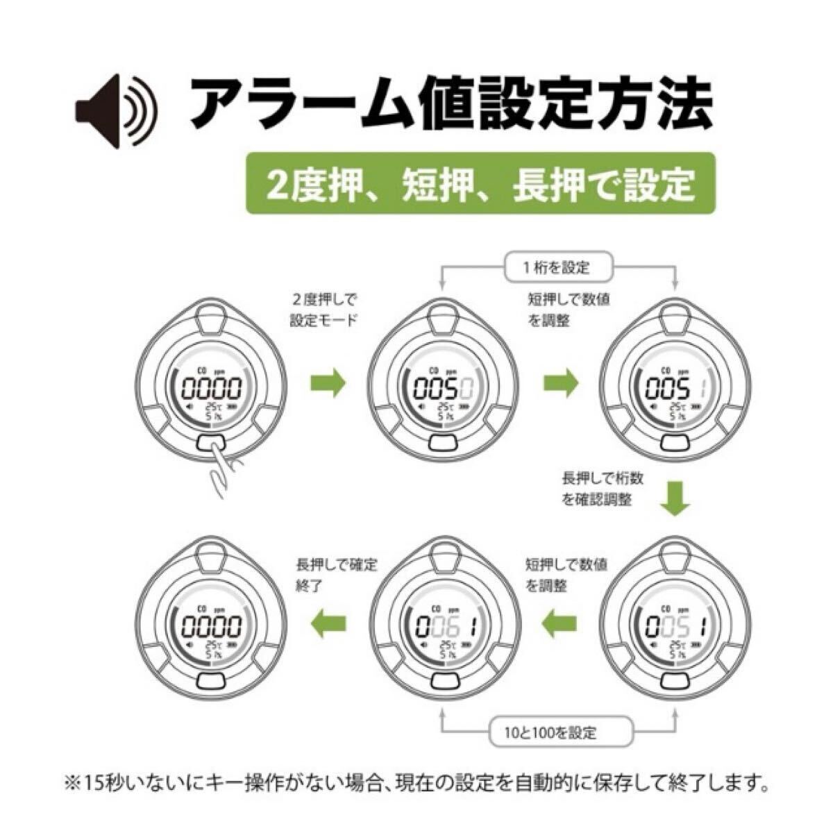 【スヌーズ機能付き】一酸化炭素濃度の数値が下がるまで、繰り返しアラームでお知らせします。ついウトウトしてしまっても安心です。