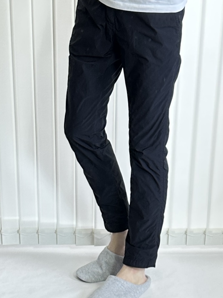 お尻まわりに程好く余裕があり、徐々に先細にしたテーパードシルエットで