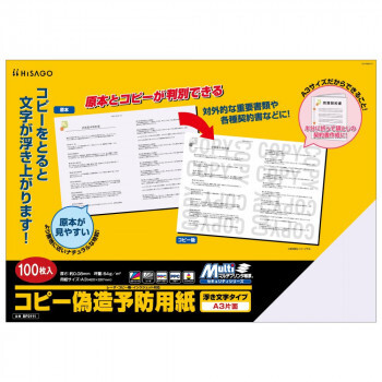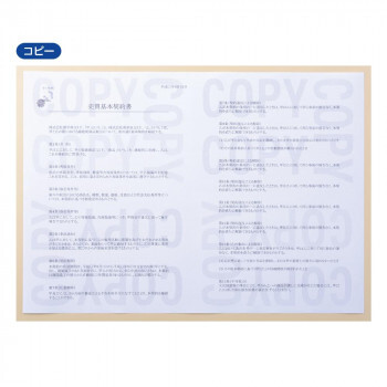 | コピーをとるとCOPYの文字が浮き上がります。原本の地紋が非常にナチュラルで、見やすく、原本を見ただけでは文字が浮き出てくることがわかりにくくなっています。A3サイズなので、図面やデザインなど、また契約書などの袋とじ書類に最適です。 【注意事項】 ※表示画像は実際と多少異なる場合がございます。 ※本製品は、その利用により、いかなる改ざんも防止することを保証するものではありません。 ※お使いになるコピー機の状態によっては、正常な効果が得られない場合があります。 ※コピー側の書類の内容を読めなくするものではありません。 ※FAX・スキャナでも同様の効果が得られます。 |