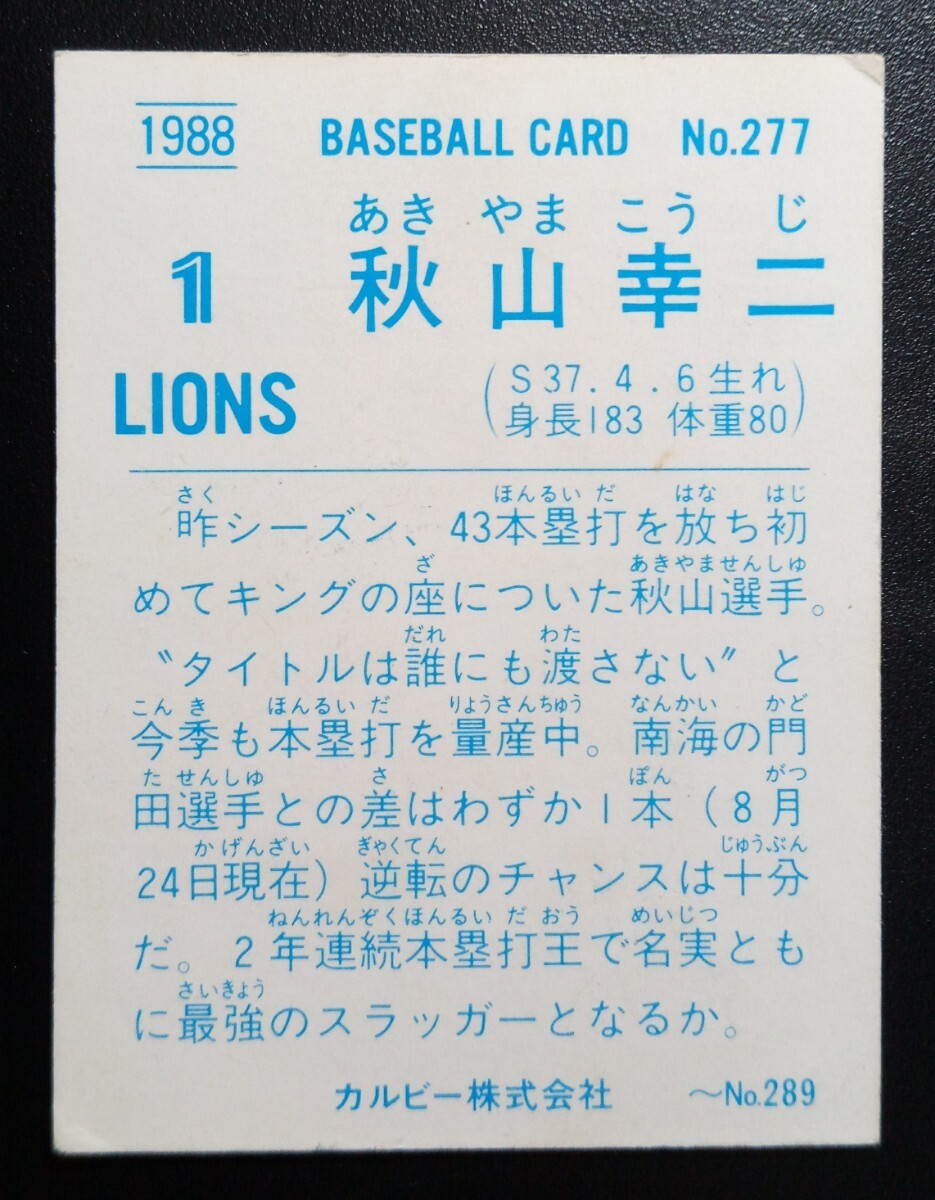 80s カルビー 1988年 ベースボールカード プロ野球 西武ライオンズ 背番号1 秋山幸二 カード 1枚になります。