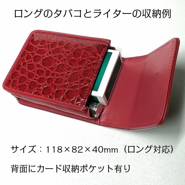 | 商品説明 | 「エナメルクロコ シガレットケース」 艶のある本体にクロコダイルのデザインがお洒落なタバコケースです。 タバコが箱ごとすっぽり入り、ライターが入るスペースもありますのでとても便利。カバンの中でタバコの葉が散らばることが無くなります。 蓋はマグネット埋め込み式で開閉も楽々。素材はとても綺麗な艶のPVCレザーで、裏面にはカード類などを収納できるポケットが付いています。 タスポなどの収納にお使いいただけます。 |