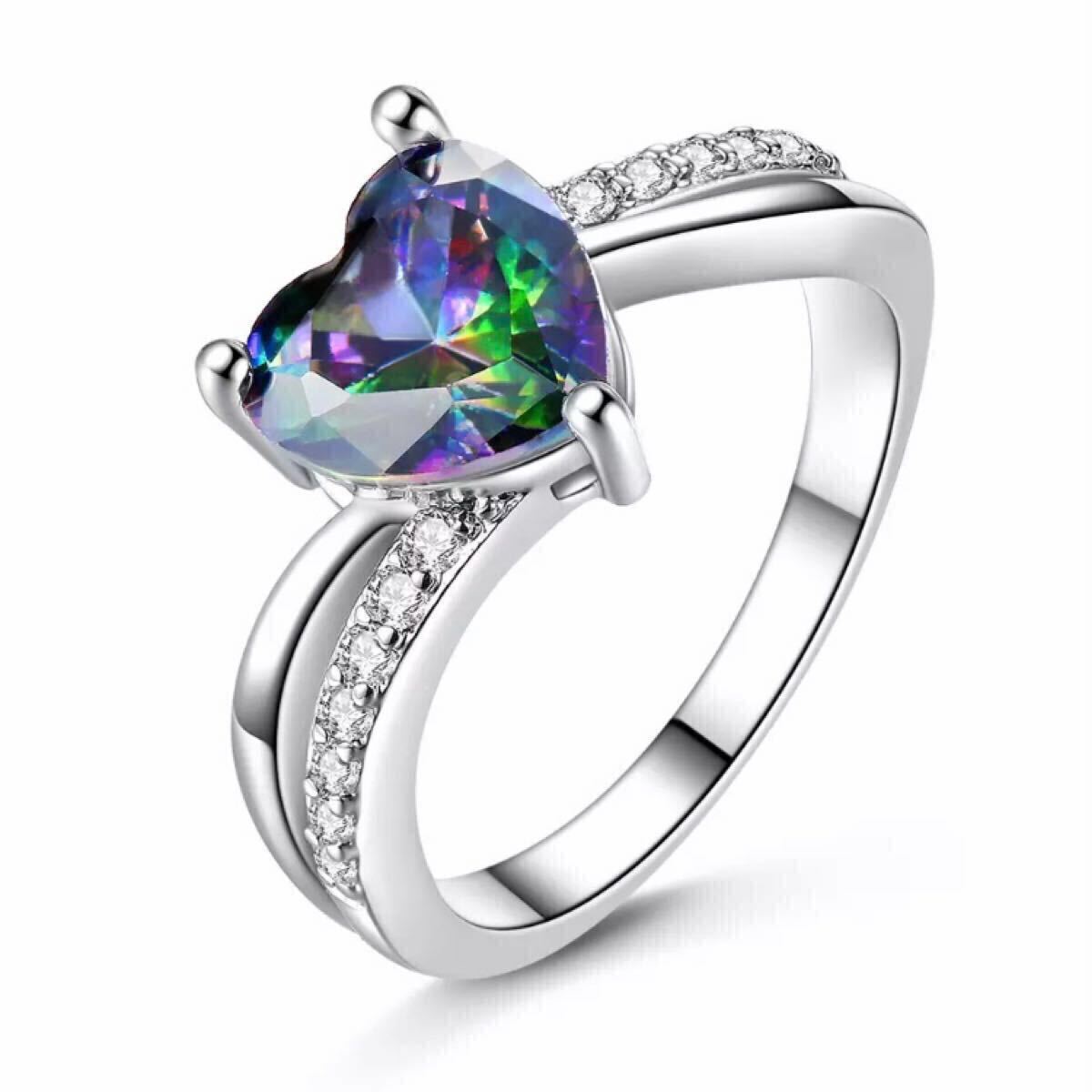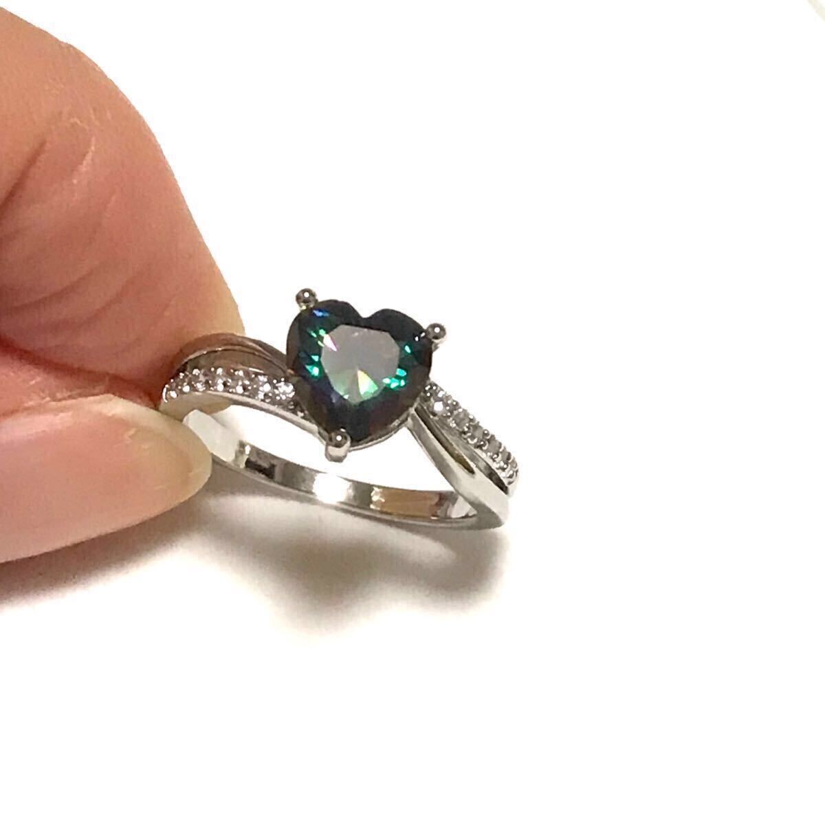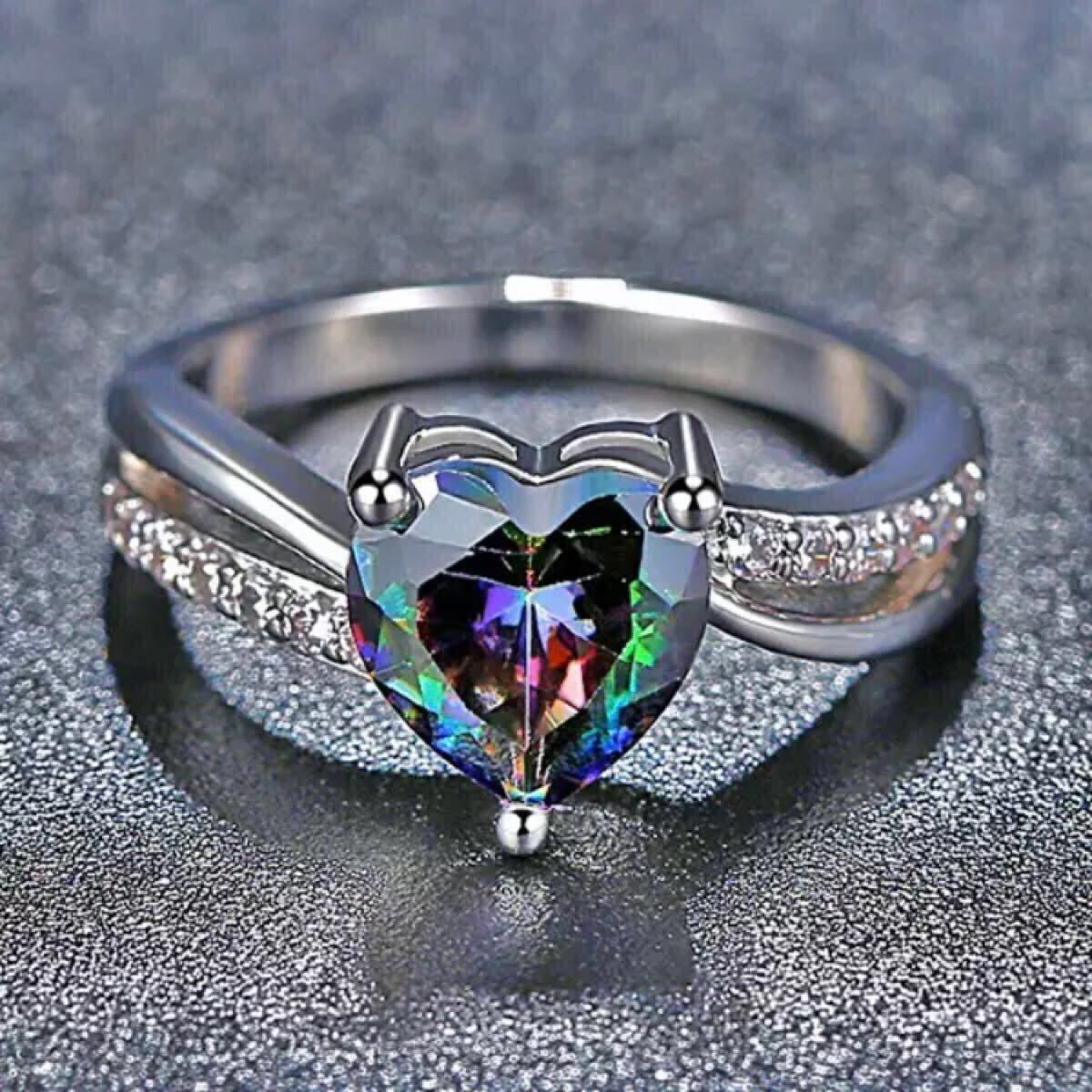 中央にあるハートのAAACZミスティックトパーズ と、両サイドのCZダイヤの輝きが華やかなリングです。シンプルながら可愛いらしいデザインで、どんなファッションにも良く合うお品です。