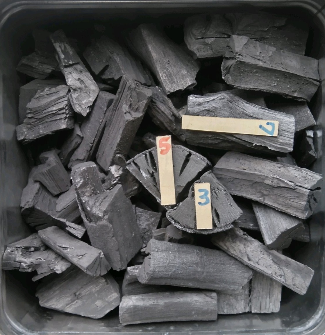 大きさの揃った分を取り分けた後の不揃いの炭です。