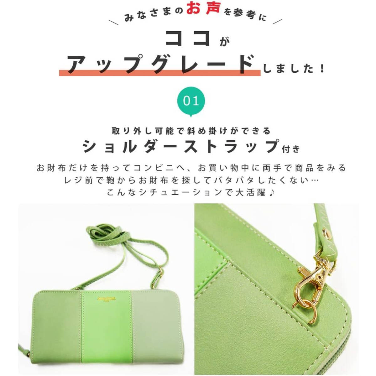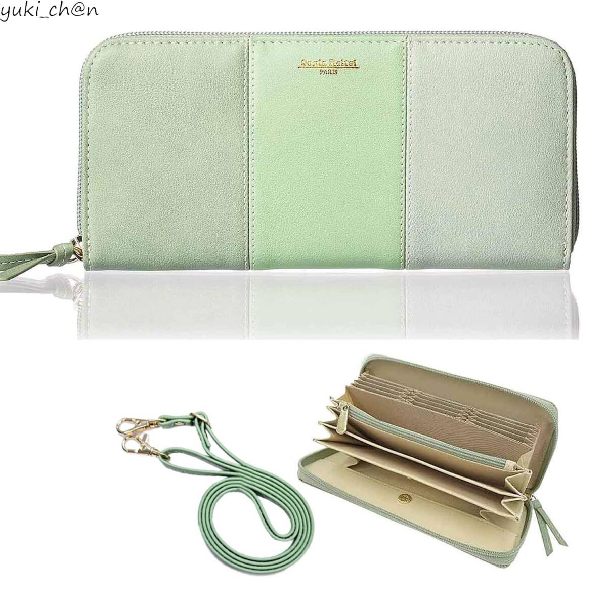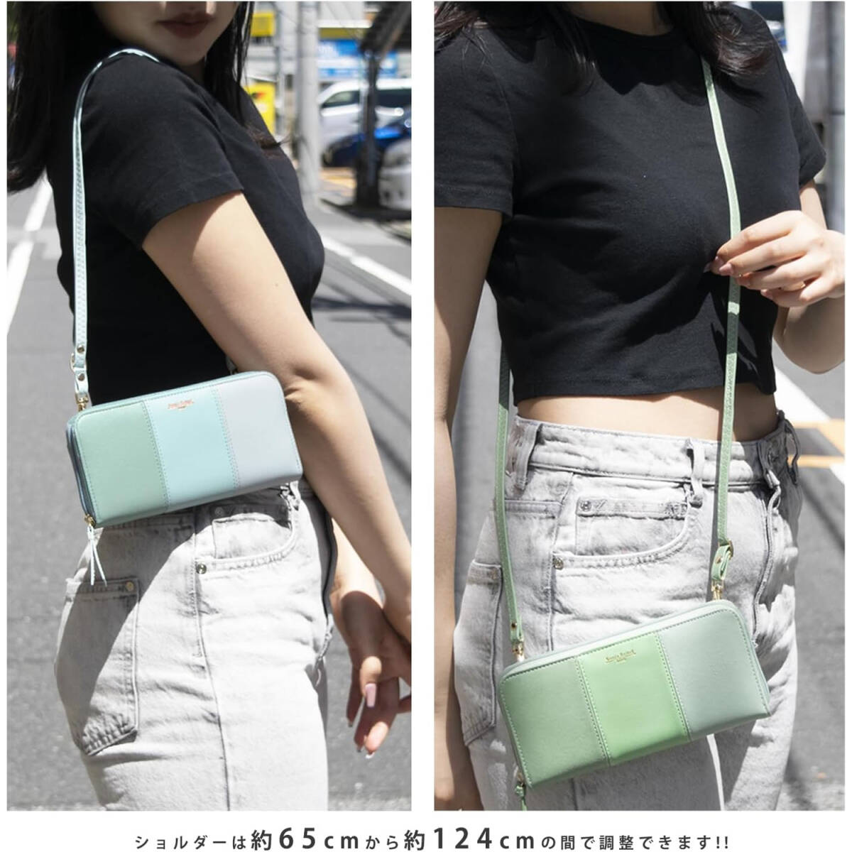 長財布 ライトグリーン ショルダー付き フェイクレザー ラウンドファスナー ポーチウォレット 背面ポケット バイカラー 金運 運気アップ