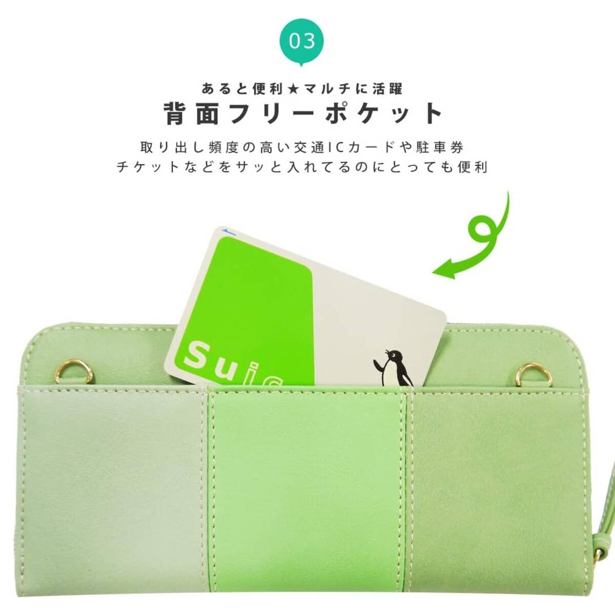 カードポケットにはICカードを収納しておけばそのままスキャンができるので、駅の改札の煩わしさも軽減してくれます。