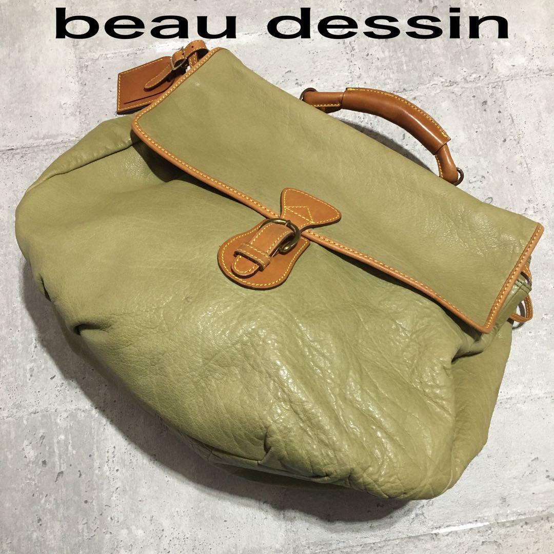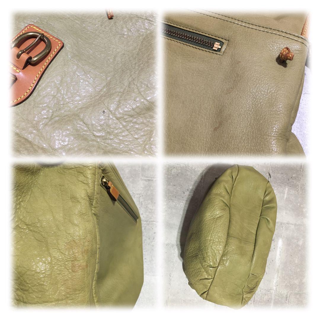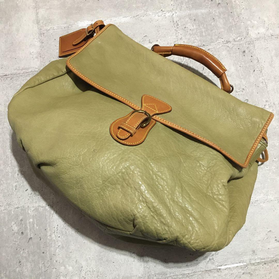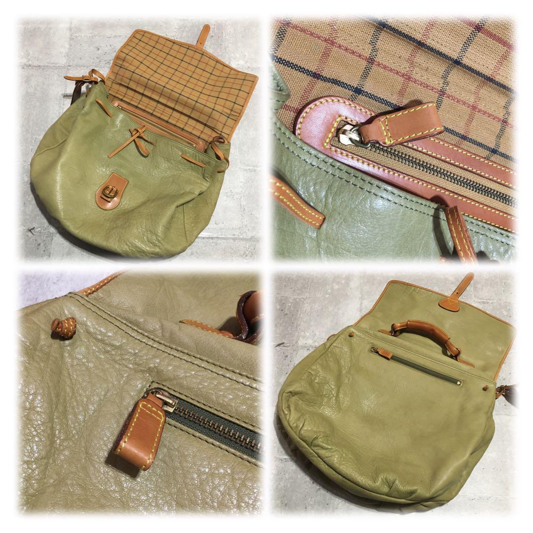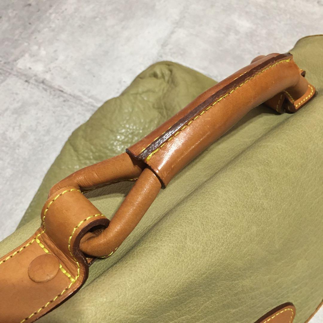 淡いオリーブカラーのレザーバッグでコロンとした形がとても可愛いハンドバッグです。