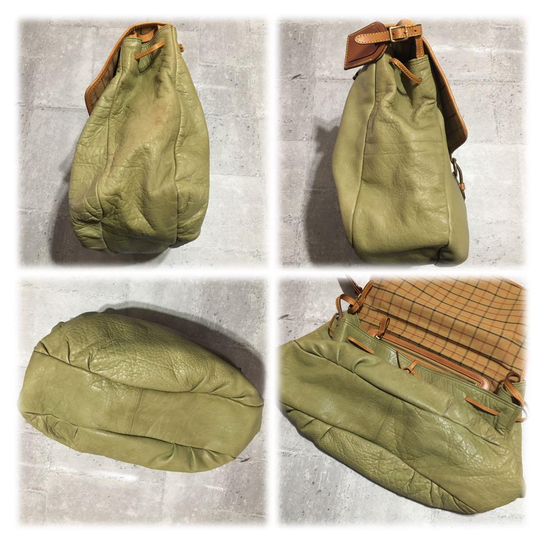オリーブグリーンのレザー製フラップバッグ、内部にジッパーポケットあり。