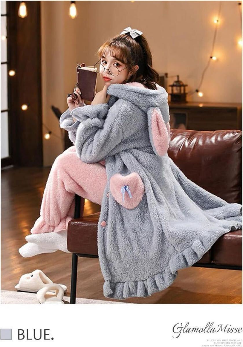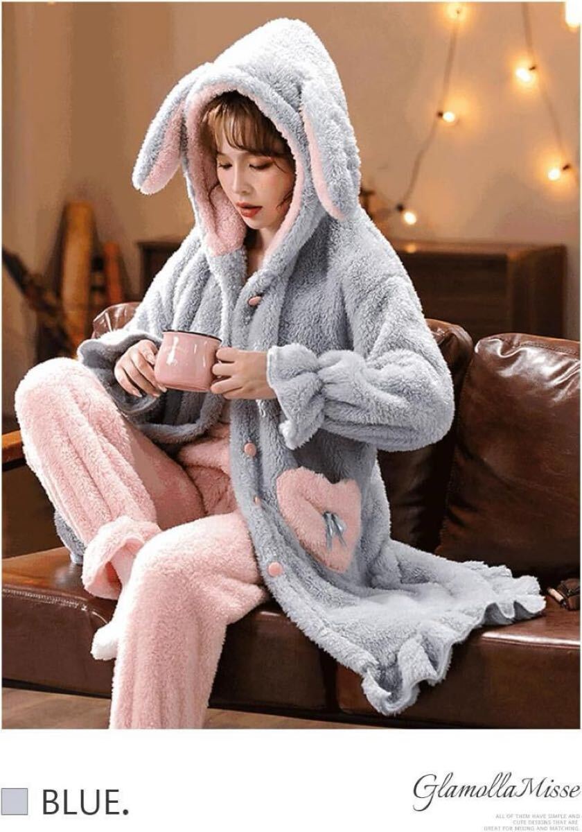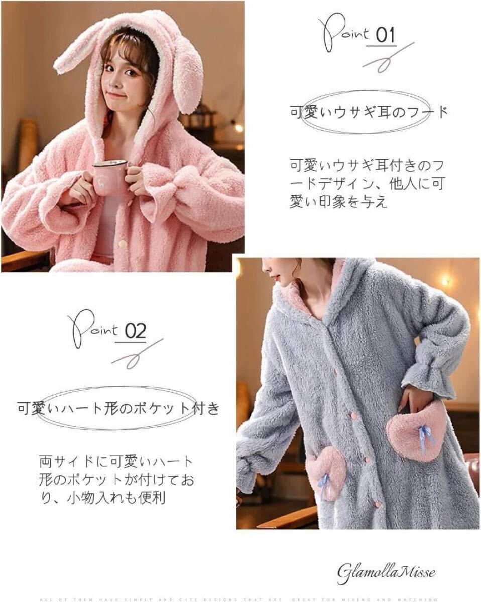 [GlamollaMisse] パジャマ レディース トップス ウサギ耳 フード付き ポケット付き ボタン付き 長袖 ロング丈 大きいサイズ オシャレ もこもこ 厚手 暖かい 可愛い 体型カバー 部屋着 ファッション ルームウェア 上着 春秋冬