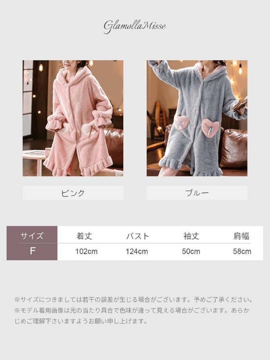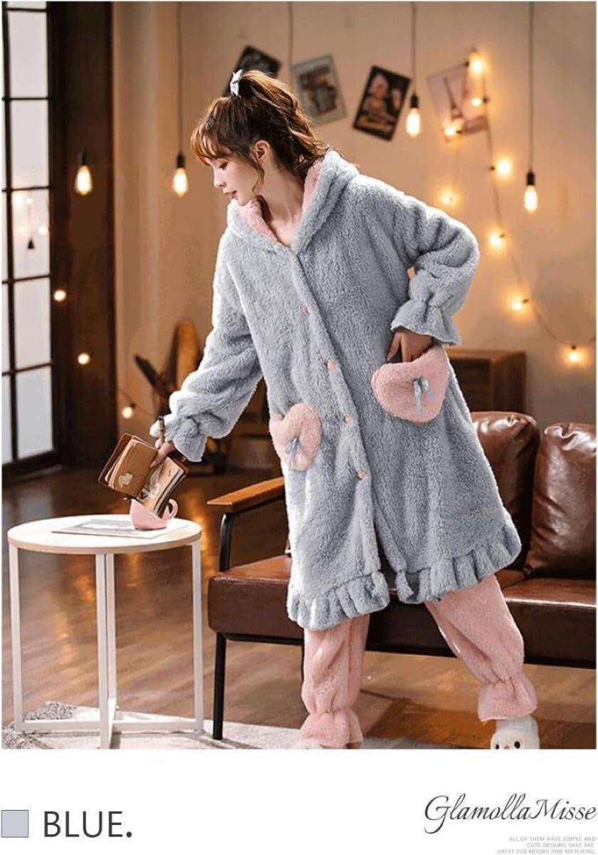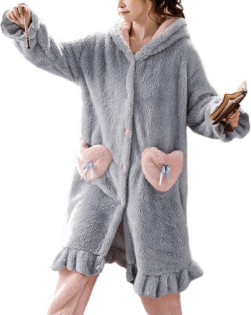 [GlamollaMisse] パジャマ レディース トップス ウサギ耳 フード付き ポケット付き ボタン付き 長袖 ロング丈 大きいサイズ オシャレ もこもこ 厚手 暖かい 可愛い 体型カバー 部屋着 ファッション ルームウェア 上着 春秋冬
