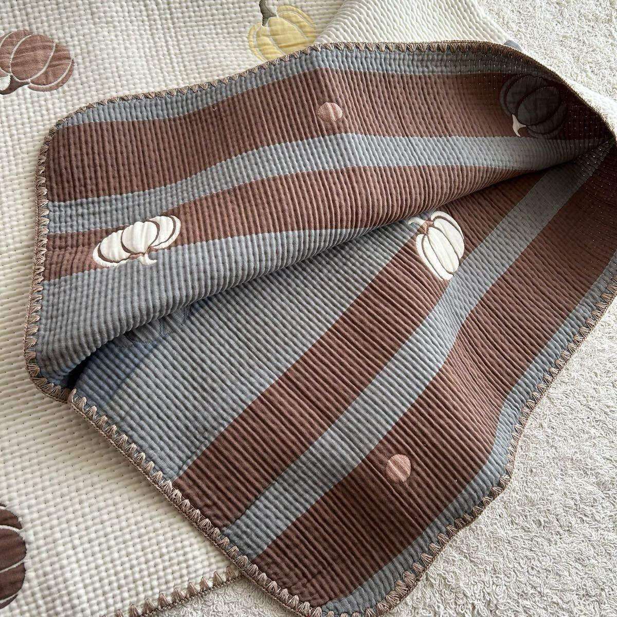 カラフルなカボチャ柄が入った、イブル ジャガード リバーシブル ブランケット。 ジャガードのぽこぽこした網目とさらさらした気持ち良い肌触り、程よい厚みで柔らかい、オールシーズン快適なイブル。