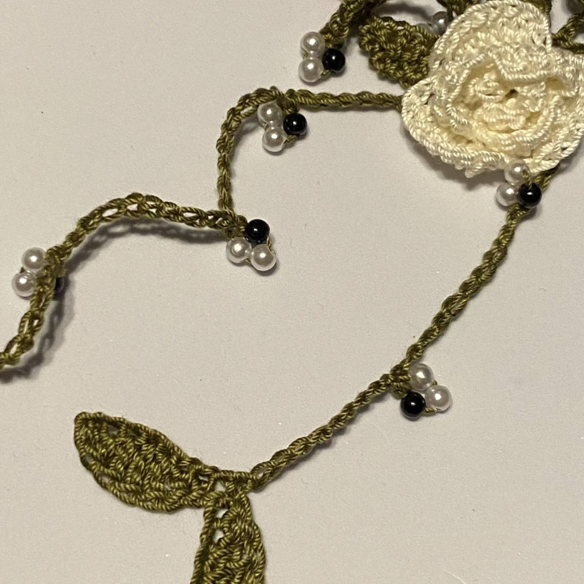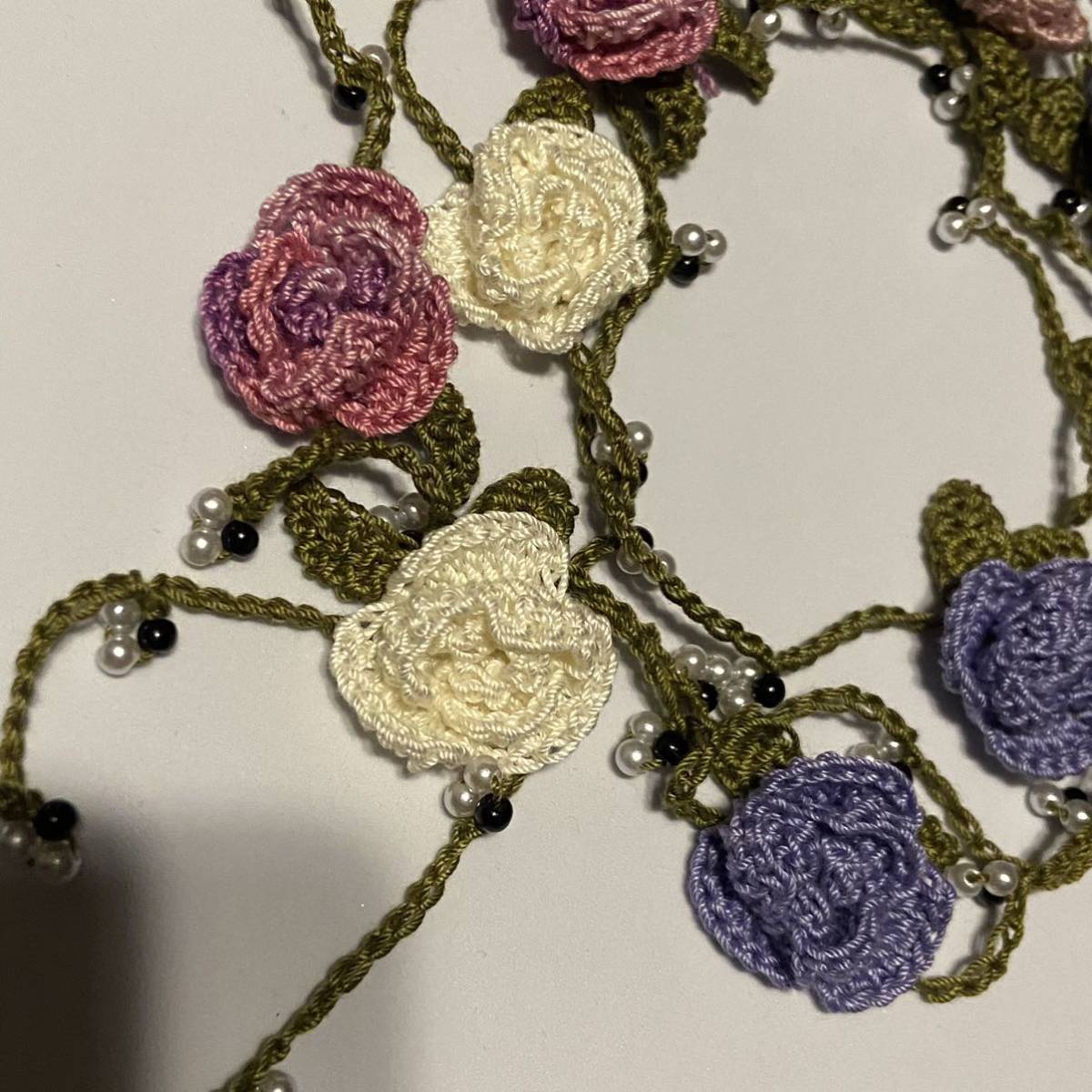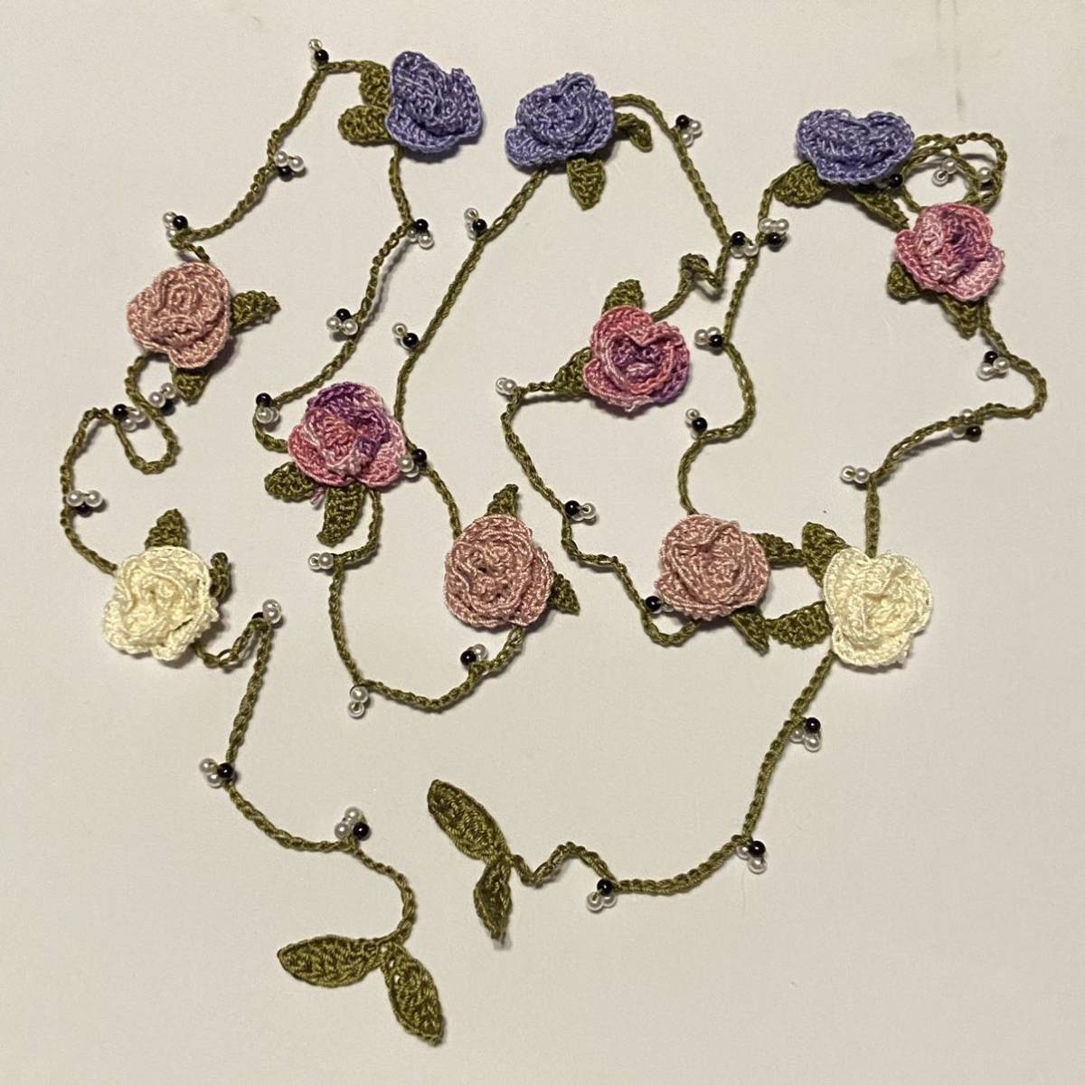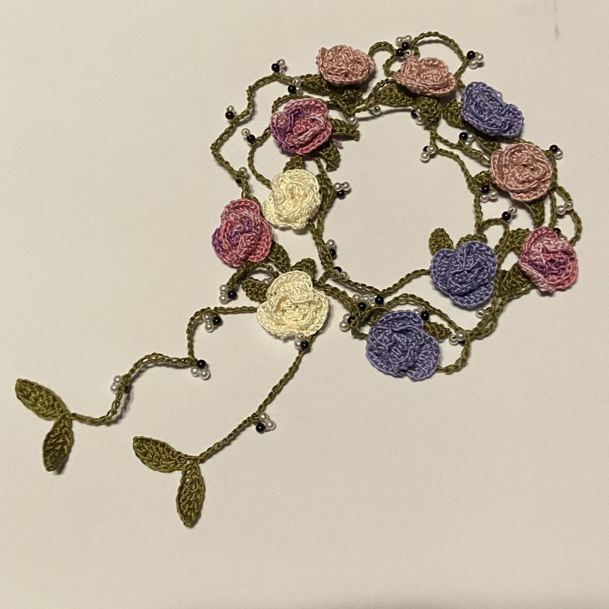 ハンドメイド、レース糸で編んだ、ピンク系、オフホワイト、パープルのバラ ローズのラリエットです。
