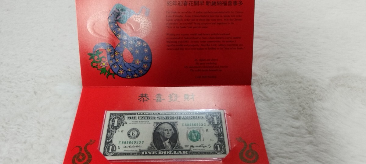 ラッキーマネー(Lucky Money)干支 巳 蛇 (Snake) 1ドル紙幣 888シリアル番号