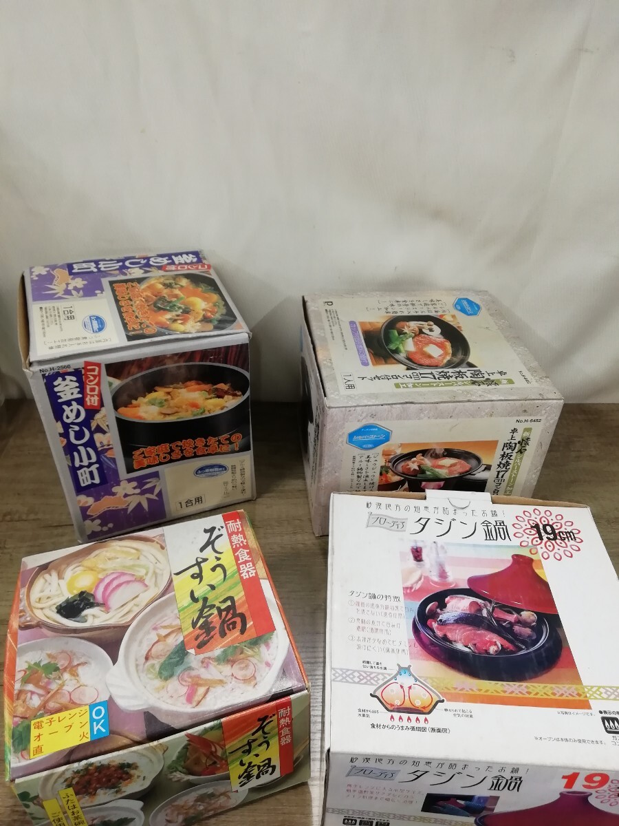 一人用サイズのお鍋4点、中古まとめ売りです。陶器製タジン鍋、1合炊き羽釜、陶器製雑炊鍋、懐石コンロ鍋の4点未使用です。固形燃料などは入っていません。