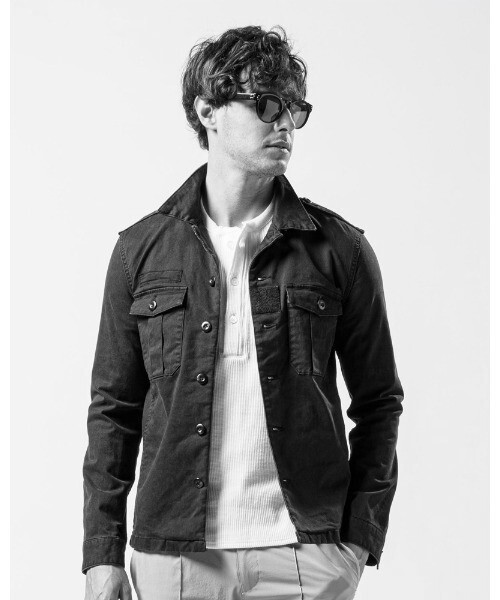 固い印象になりがちなアーミーシャツをカジュアルに仕上げている。