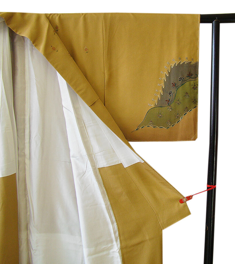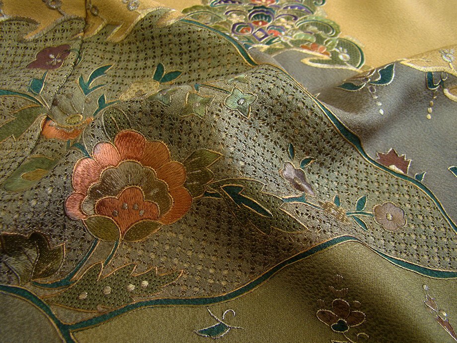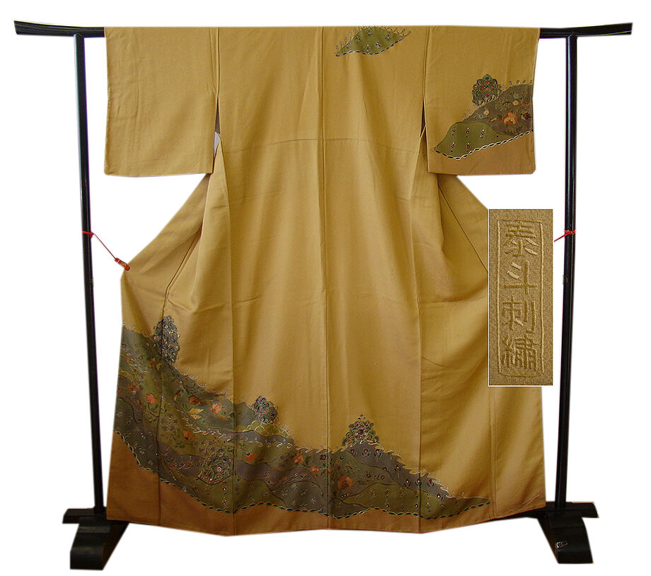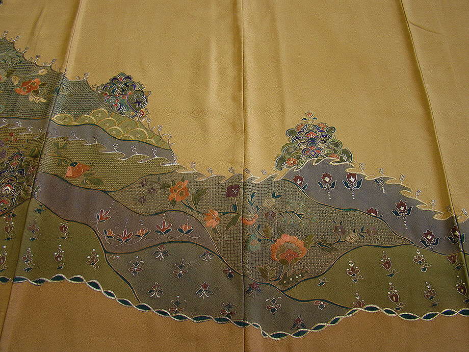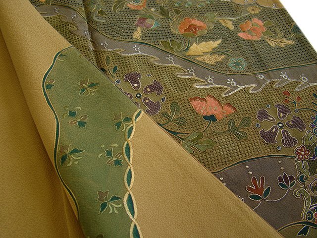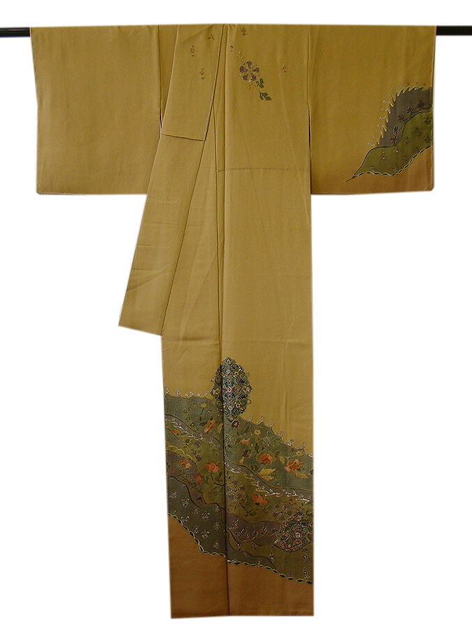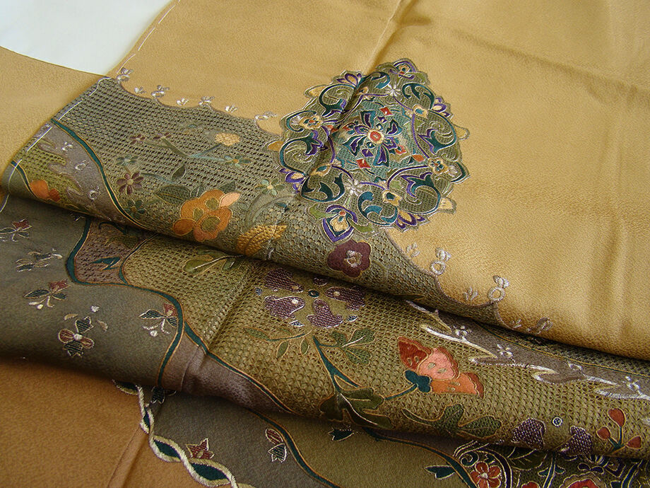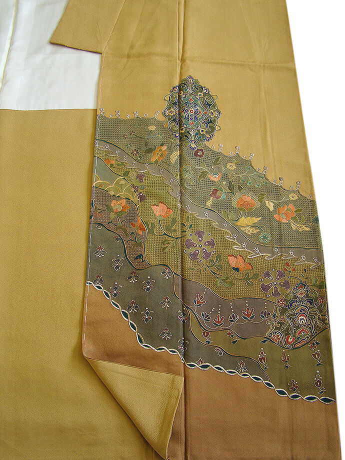 商品説明 | こちらのお品は「袷」でございますので、10月~5月にお召頂ければと思います。 しなやかで滑らかな手触りの着心地良いぽってりとした重めの極上ちりめん地の生地、 渋い金茶色地に裾にかけて濃いキャメル色ぼかし染に、精緻な手技を駆使した極め細やかな 花草柄の総刺繍が丁寧に刺繍され、重厚感のある匠の技の美しさをご堪能頂ける仕上がりです。 お慶びのお席や今日を美しく愛でるかの様な装いを印象付ける 正統派のお着物として一枚は欲しい麗しいお着物でございます。 八掛は共布に柄入り(正絹)、幅広い年代の方にお召し頂けます。 |
