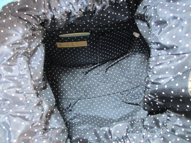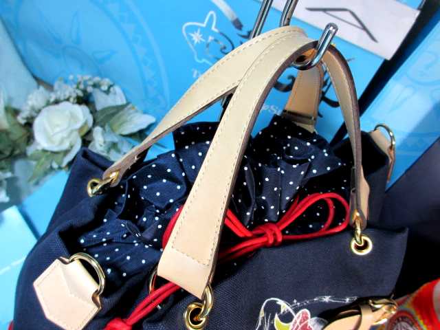 開口部が巾着式で内側ドット柄がちらりと見えるのもポイント。