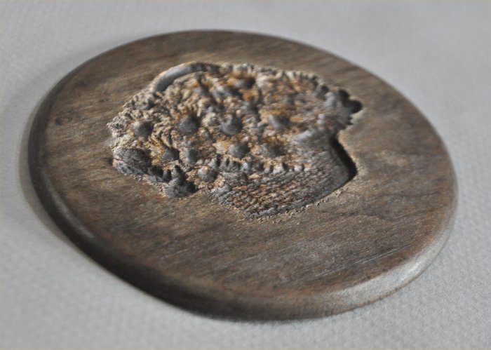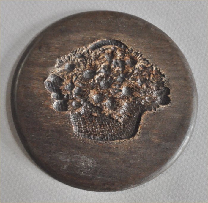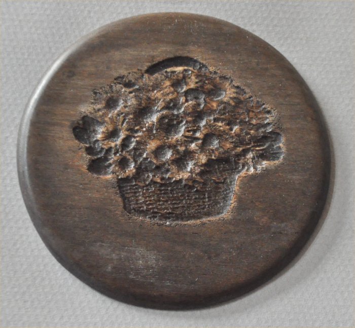 レーザー彫の花かごラウンドプレート88mm径サイズは88mm径厚み4mm磨き仕上げ素材ブラックウォールナット大きなラウンドプレートに花かごをレーザー彫で彫ったプレートです。